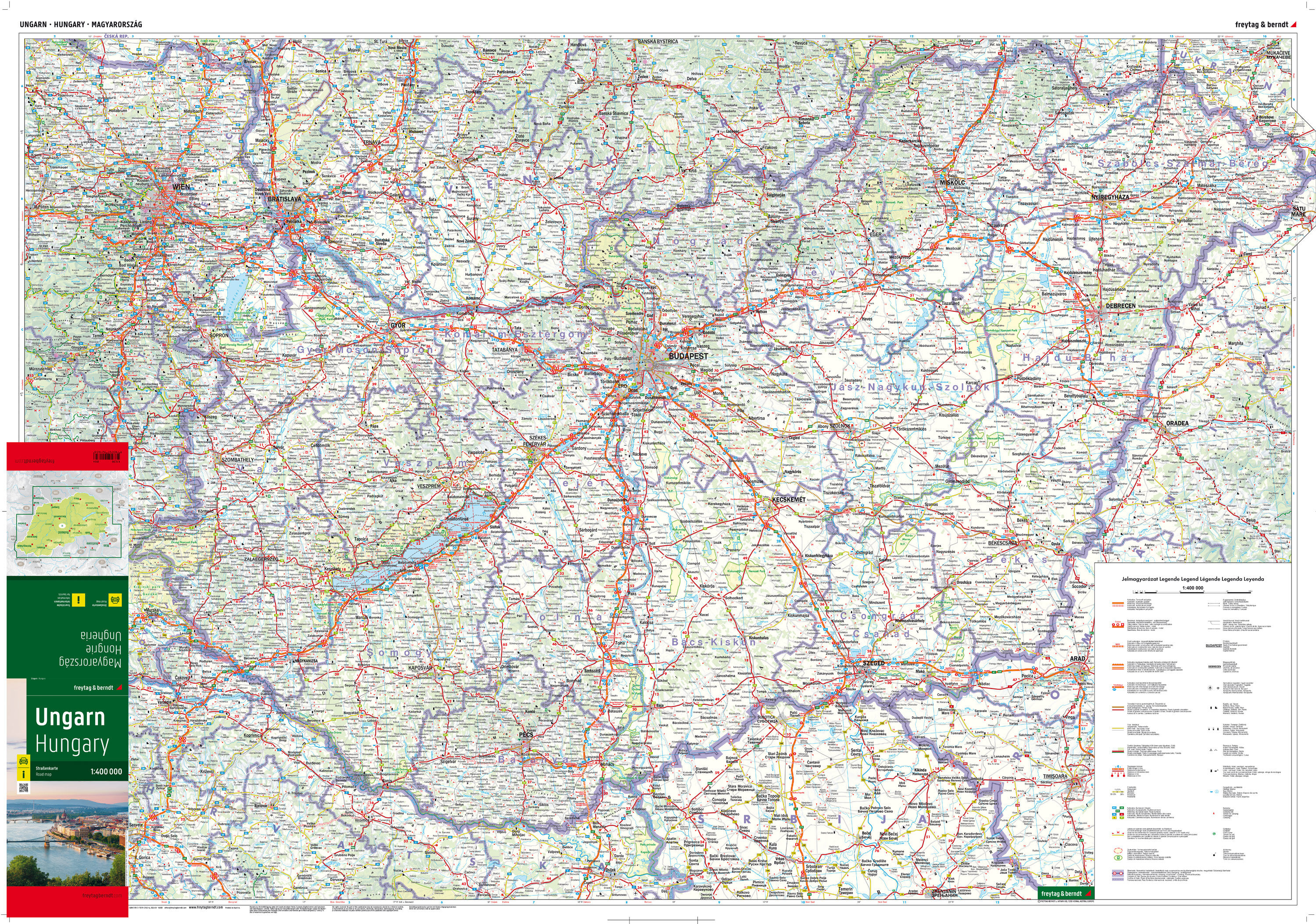 Mit der Straßenkarte Ungarn im Maßstab 1:400.000 finden sich Urlauber die mit Auto, Motorrad oder Wohnwagen unterwegs sind bestens zurecht. Das weit verzweigte Straßennetz ist exakt abgebildet, Entfernungen und viele Ausflugsziele sind in der Karte eingezeichn...