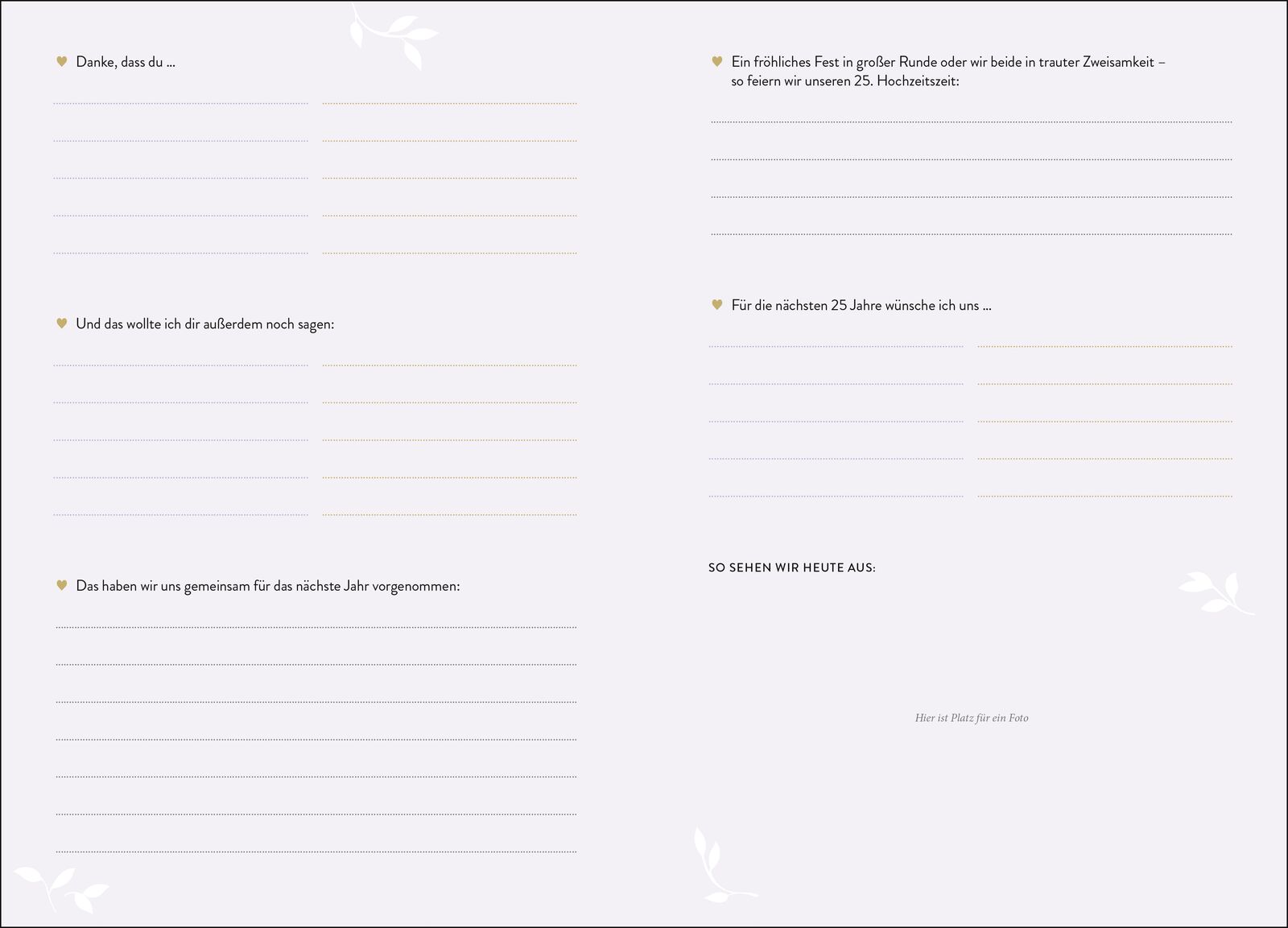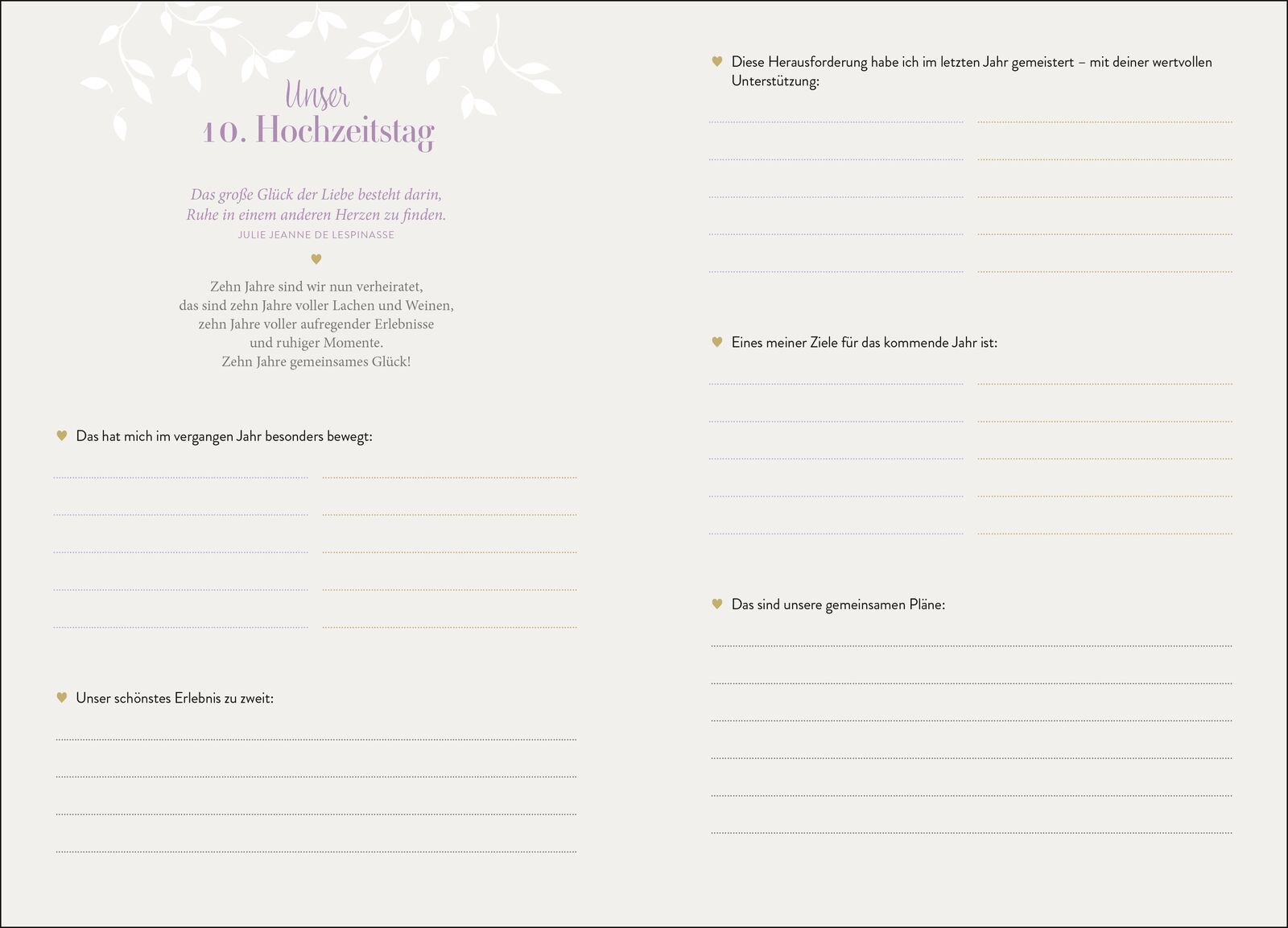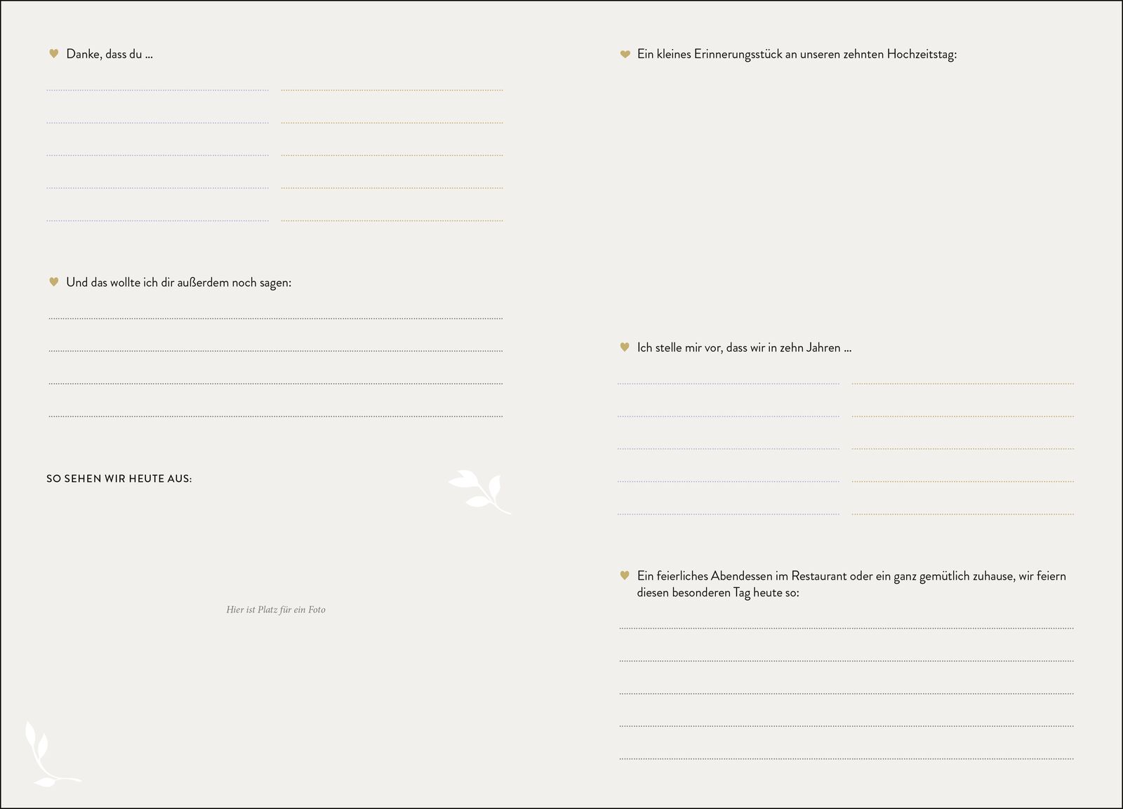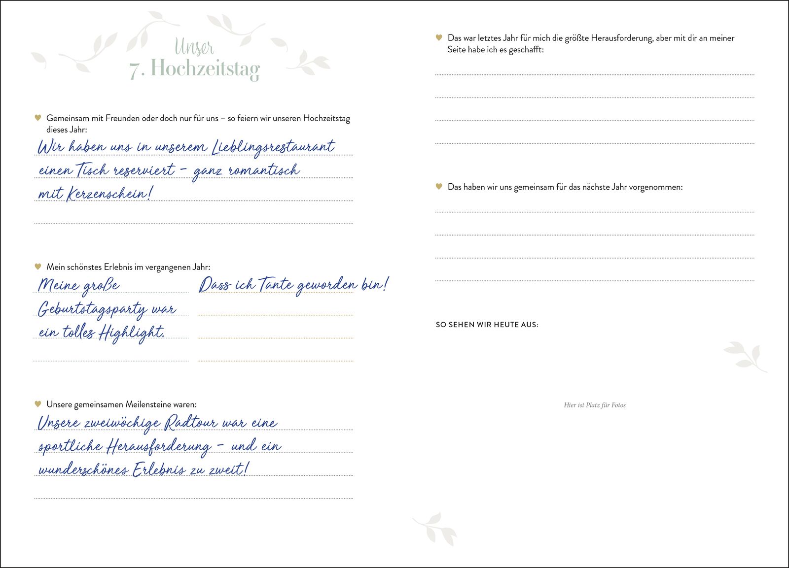 Hochwertiges Erinnerungsbuch für Ehepaare das perfekte Geschenk zur Trauung Feiert eure Liebe vom Tag eurer Trauung bis zur Goldenen Hochzeit! In diesem edlen Hochzeitsalbum haltet ihr zu jedem eurer Hochzeitstage Gedanken und Erinnerungen fest. Mithilfe span...