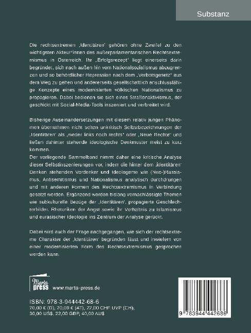 Die rechtsextremen Identitären' gehoren ohne Zweifel zu den wichtigsten Akteurinnen des außerparlamentarischen Rechtsextremismus in Osterreich. Ihr Erfolgsrezept liegt einerseits darin begrundet, sich nach außen hin vom Nationalsozialismus abzugrenzen und so b...