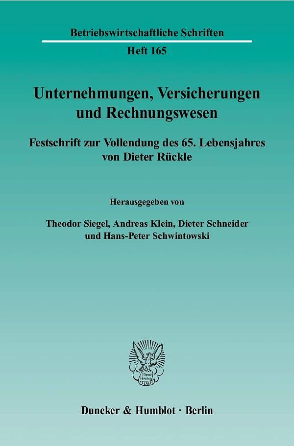Betriebswirtschaftliche und juristische Autoren aus Hochschule und Praxis ehren Professor Dr. Dieter Rückle anlässlich der Vollendung seines 65. Geburtstags mit einer Festschrift, welche die vielfältigen Wirkungsbereiche dieses herausragenden Forschers widersp...Betriebswirtschaftliche und juristische Autoren aus Hochschule und Praxis ehren Professor Dr. Dieter Rückle anlässlich der Vollendung seines 65. Geburtstags mit einer Festschrift, welche die vielfältigen Wirkungsbereiche dieses herausragenden Forschers widerspiegelt. Bei Dieter Rückle spannt sich der Bogen u. a. von einem Grundlagenwerk der Steuerbilanzpolitik über Fragestellungen kapitalmarktorientierter Rechnungslegung und Abschlussprüfung bis zur ökonomischen Analyse der Beziehungen zwischen Versicherern und Versicherten, wobei er sich erfolgreich - in Kooperation mit Juristen - zugunsten angemessener und marktgerechter Schutzmechanismen für Versicherte einsetzt. Das breite Spektrum und die kritische Auseinandersetzung des Autors drücken auch die 28 Beiträge in der Festschrift aus. So werden im Teil A "Unternehmen, Unternehmenswert und Banken" u. a. aktuelle Probleme wie z. B. der Berliner Bankenskandal diskutiert. Im Teil B "Versicherung" wird die Interdisziplinarität von Dieter Rückle eindrucksvoll belegt, indem mehrheitlich juristische Autoren auf weitere offene Fragen im Versicherungsbereich eingehen. Teil C umfasst mit "Rechnungslegung" einen breiten Rahmen zwischen Norm-Fortentwickung und Einzelfragen wie zur Fair-Value-Bewertung und branchenspezifischen Sonderfragen. Im Teil D "Steuern" werden Fragen der Steuerwirkungen und -politik aufgeworfen, bevor sich der Kreis mit Teil E "Prüfung" u. a. zu Konsequenzen des Sarbanes-Oxley Act und zum Unabhängigkeitsproblem bei Wirtschaftsprüfern (und Hochschullehrern) schließt.