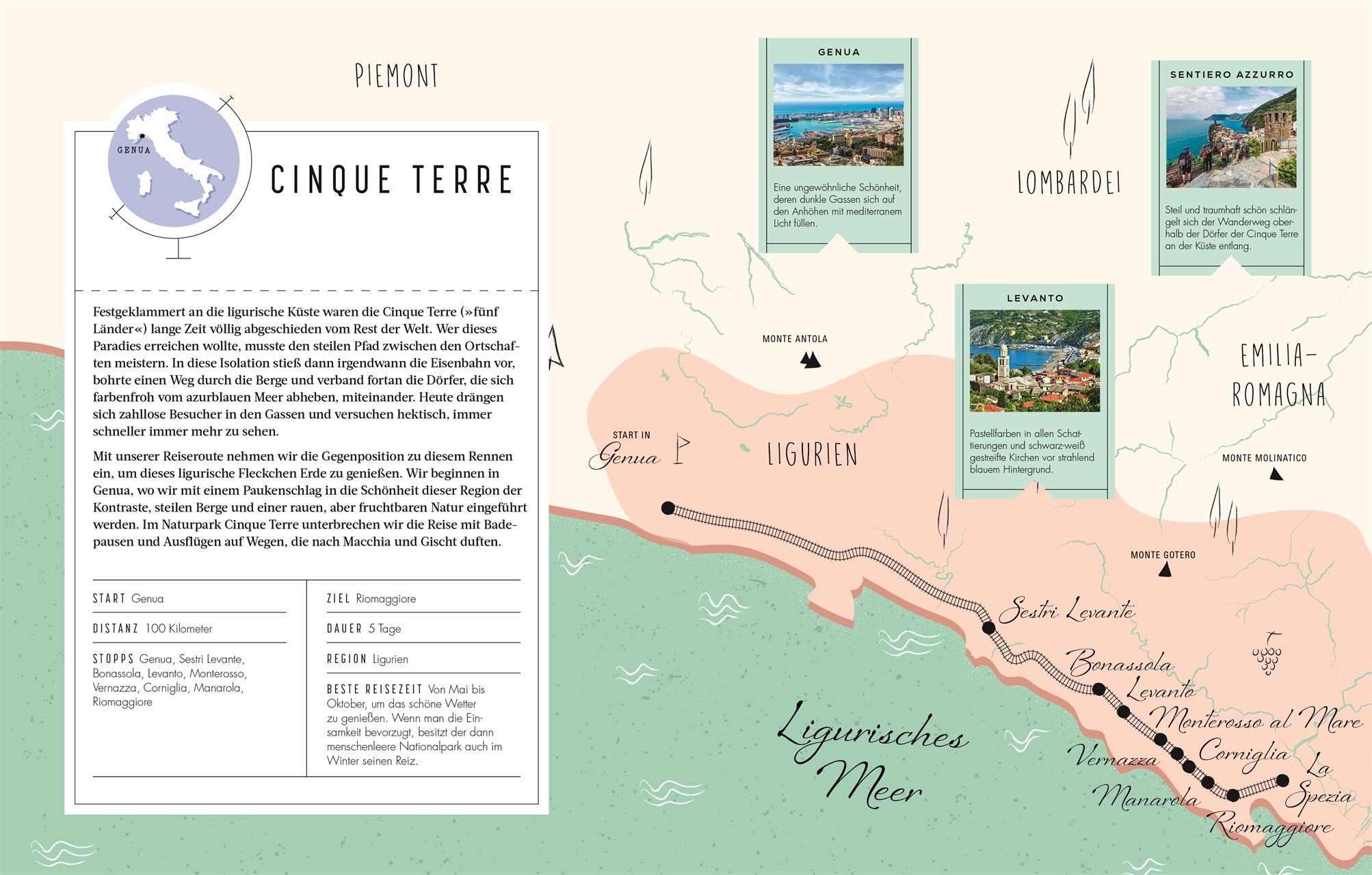 Mit dem Zug durch Italien Majestätische Berggipfel erstrecken sich in den Himmel, sanfte Hügel rollen sich aus wie grüne Teppiche und das glitzernde Mittelmeer schimmert verlockend in der Ferne: Während die malerischen Landschaften Italiens an Ihnen vorüberzi...