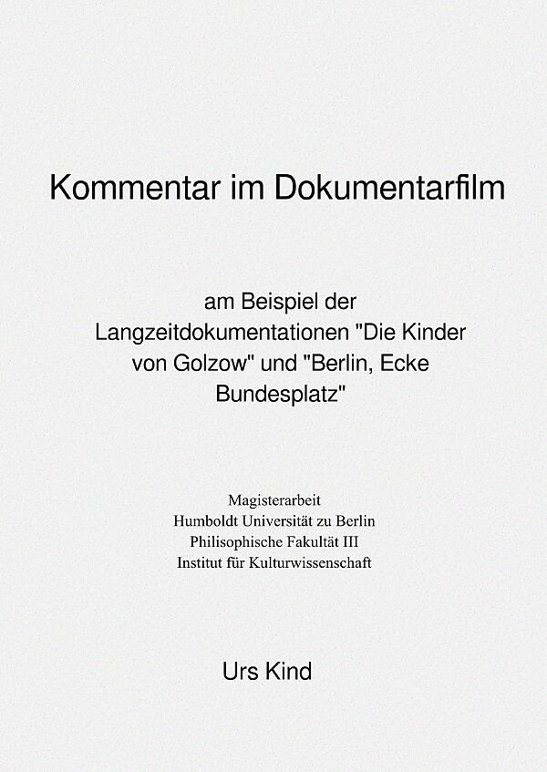 In seiner Magisterarbeit untersucht Urs Kind die Funktion des Kommentars im Dokumentarfilm anhand der Langzeitdokus "Die Kinder von Golzow" (1961-2007) und "Berlin, Ecke Bundesplatz" (1986-2012). Autorentext Dr. Urs Kind untersuchte in seiner Dissertation am A...