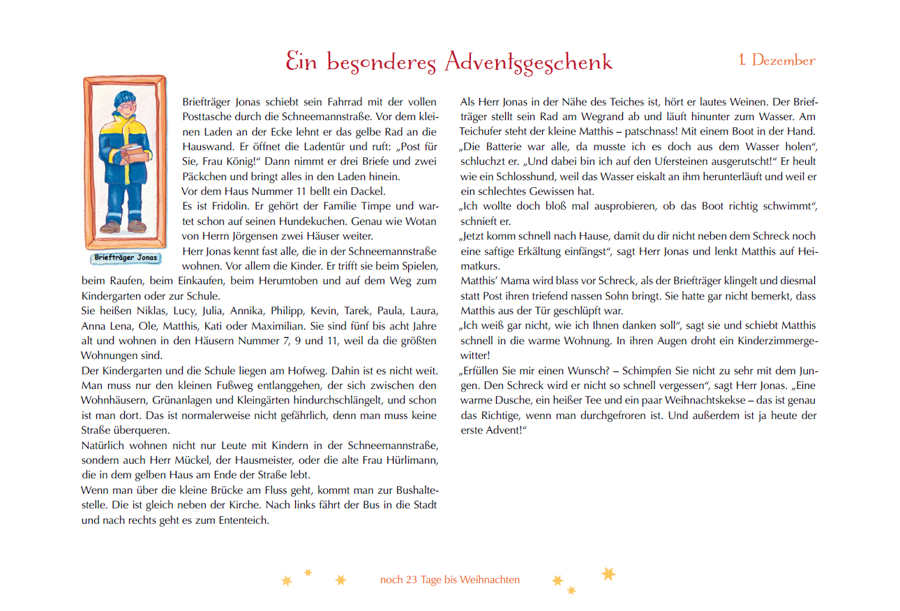 Der Adventskalender für Kinder ab 7 Jahren erzählt nicht nur in 24 Geschichten von den Advents-Erlebnissen der Kinder aus der Schneemanstraße, es liegt auch ein bunter aufklappbarer Sternenfächer bei. Ein Buch-Adventskalender mit Sternenfächer für Kinder ab 7 ...