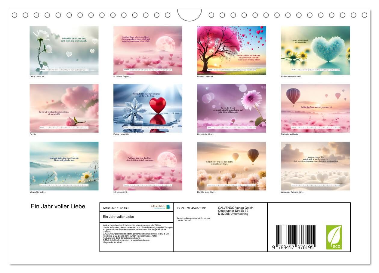 Unser Kalender 'Ein Jahr voller Liebe' bietet Ihnen 12 einzigartige Liebesmomente für jeden Monat des Jahres. Jedes Bild und jeder Liebesspruch wurde mit moderner künstlichen Intelligenz generiert, um Ihnen eine einzigartige Erfahrung zu bieten. Die Bilder sin...