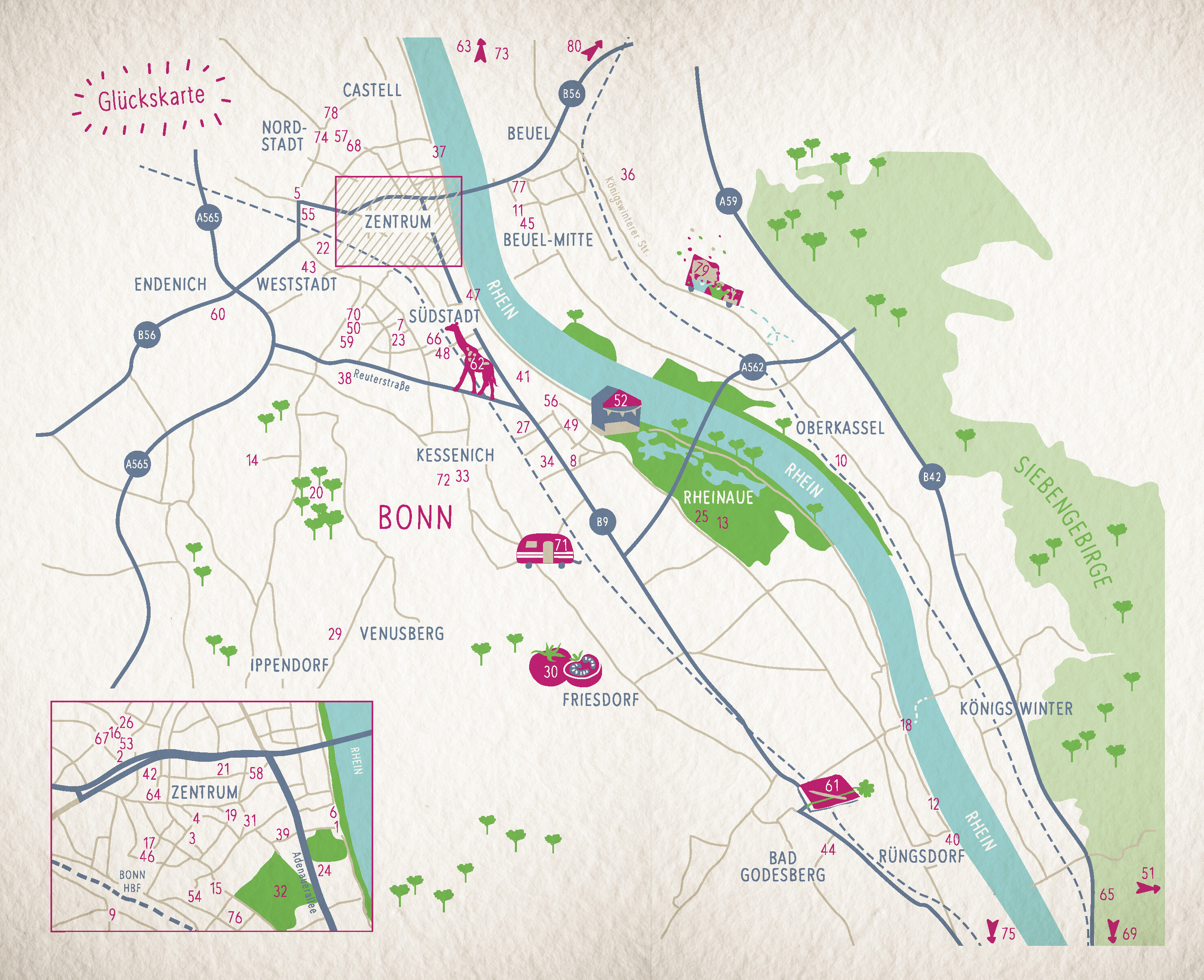 Bonn ist ein Verwandlungswunder: Hauptstadt, Bundesstadt, UN-Stadt, Studentenstadt - und sie steckt voller Glücksorte. 80 davon hat Ursula Kollritsch gefunden. Hier kann man der Kunst aufs Dach steigen, übers Wasser schweben, in einer Telefonzelle lesen, mit d...