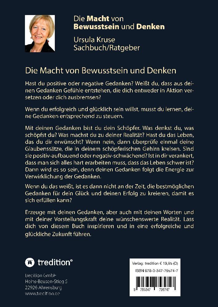 Wir Menschen streben nach Glück und Erfolg. Doch wie erreichen wir das? Das Buch zeigt auf, wie wir mit veränderter Gedankenqualität unser Leben nach unseren Vorstellungen in Richtung Glück und Erfolg kreieren können: 1.Selbstreflexion & Bewusstseinserweit...