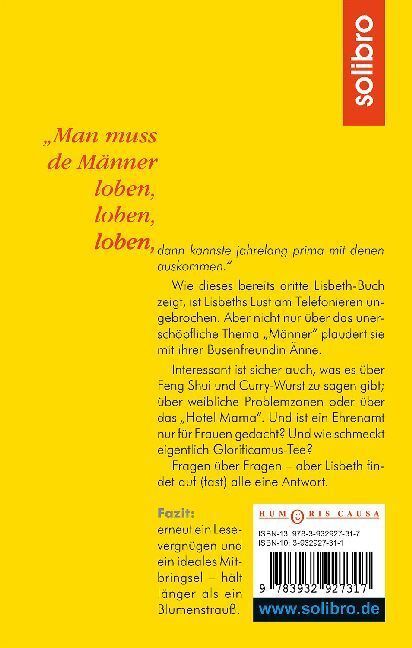 Wie dieses bereits dritte Lisbeth-Buch zeigt, ist Lisbeths Lust am Telefonieren ungebrochen. Seit die Telefongesellschaften ihre Gebühren im Laufe der Zeit gesenkt haben, sind ihre vertraulichen Gespräche mit Busenfreundin Änne noch häufiger und noch länger ge...Wie dieses bereits dritte Lisbeth-Buch zeigt, ist Lisbeths Lust am Telefonieren ungebrochen. Seit die Telefongesellschaften ihre Gebühren im Laufe der Zeit gesenkt haben, sind ihre vertraulichen Gespräche mit Busenfreundin Änne noch häufiger und noch länger geworden. Nicht nur über das unerschöpfliche Thema Männer plaudern die beiden. Interessant ist sicher auch, was es aus ihrer Sicht über Feng-Shui und Curry-Wurst zu sagen gibt; über weibliche Problemzonen und über Diabetes bei Hunden oder über zweckmäßige Grabpflege. Und ist Ehrenamt Ehrensache und nur für Frauen gedacht? Und wie schmeckt eigentlich Glorificamus-Tee? Fragen über Fragen aber Lisbeth findet auf (fast) alle eine Antwort. Also endlich mal wieder ein neues Lesevergnügen mit Lisbeth aus dem Münsterland. Und ein ideales Mitbringsel (hält schließlich länger als ein Blumenstrauß;-)