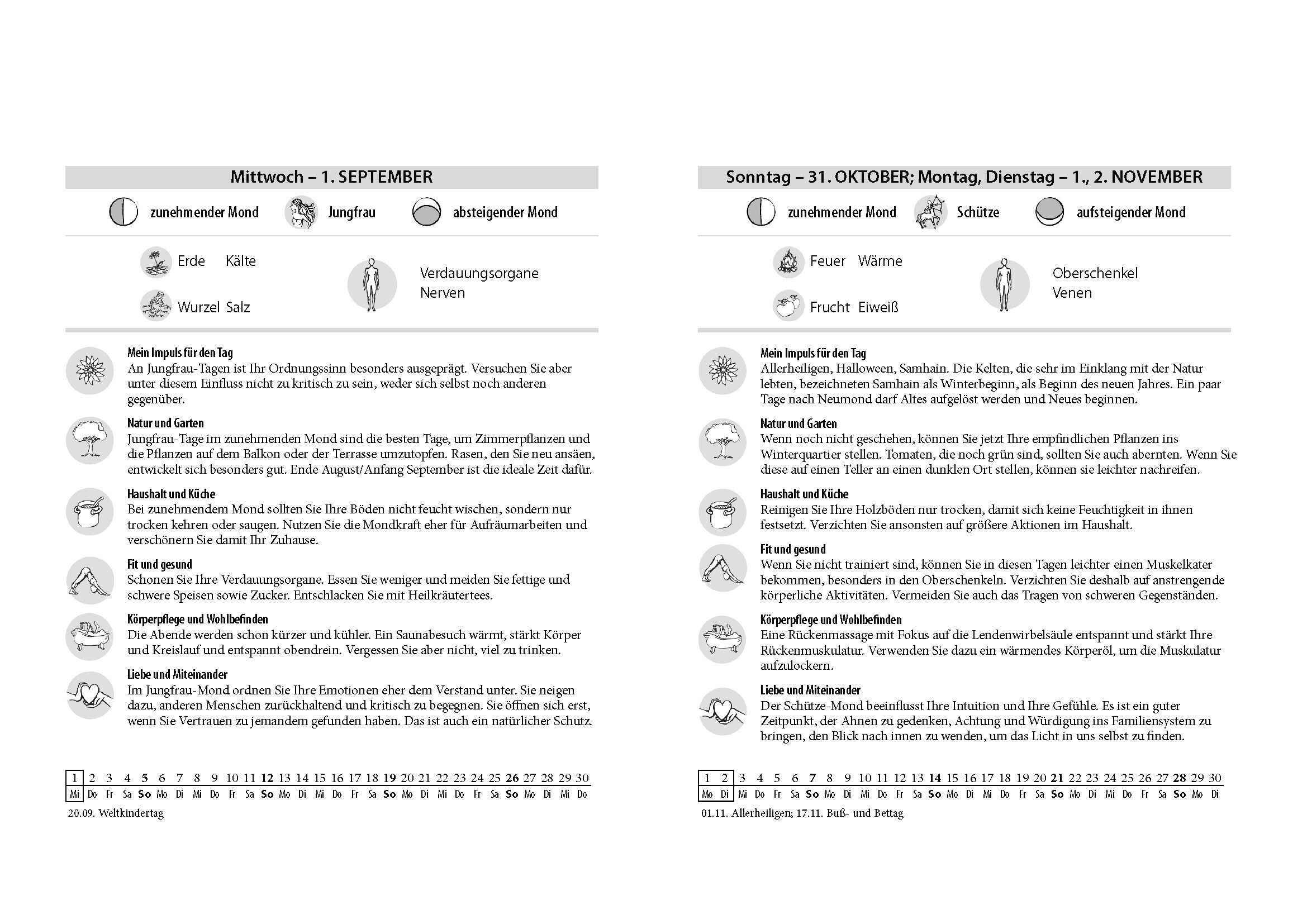 Leben im Einklang mit den Mondrhythmen Wie Sie sich jeden Tag von der Mondkraft unterstützen lassen können, zeigt dieser Kalender: Er informiert über die günstigen Tage für Hausarbeiten, Friseurbesuche oder die Pflanzenpflege. Sie erfahren, wie die Gesundheit ...