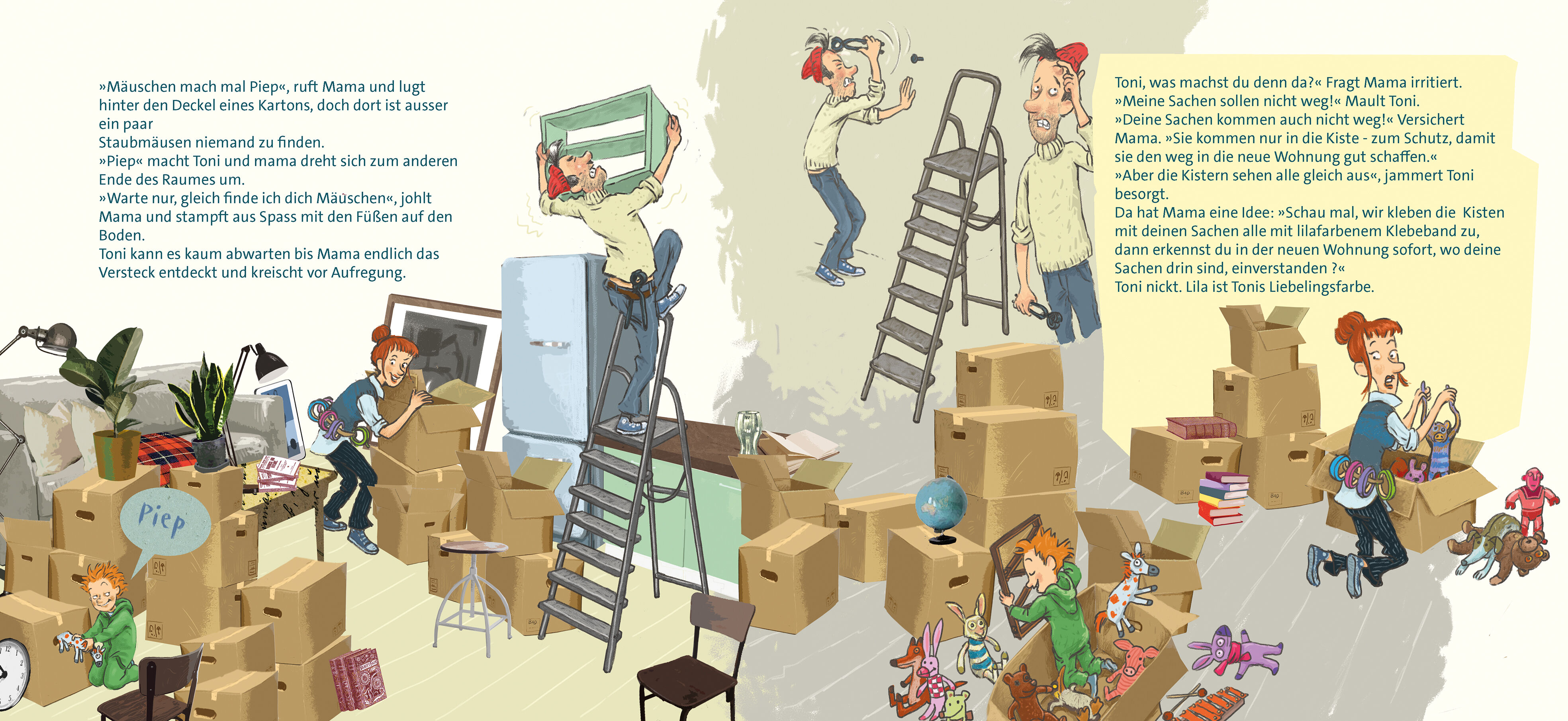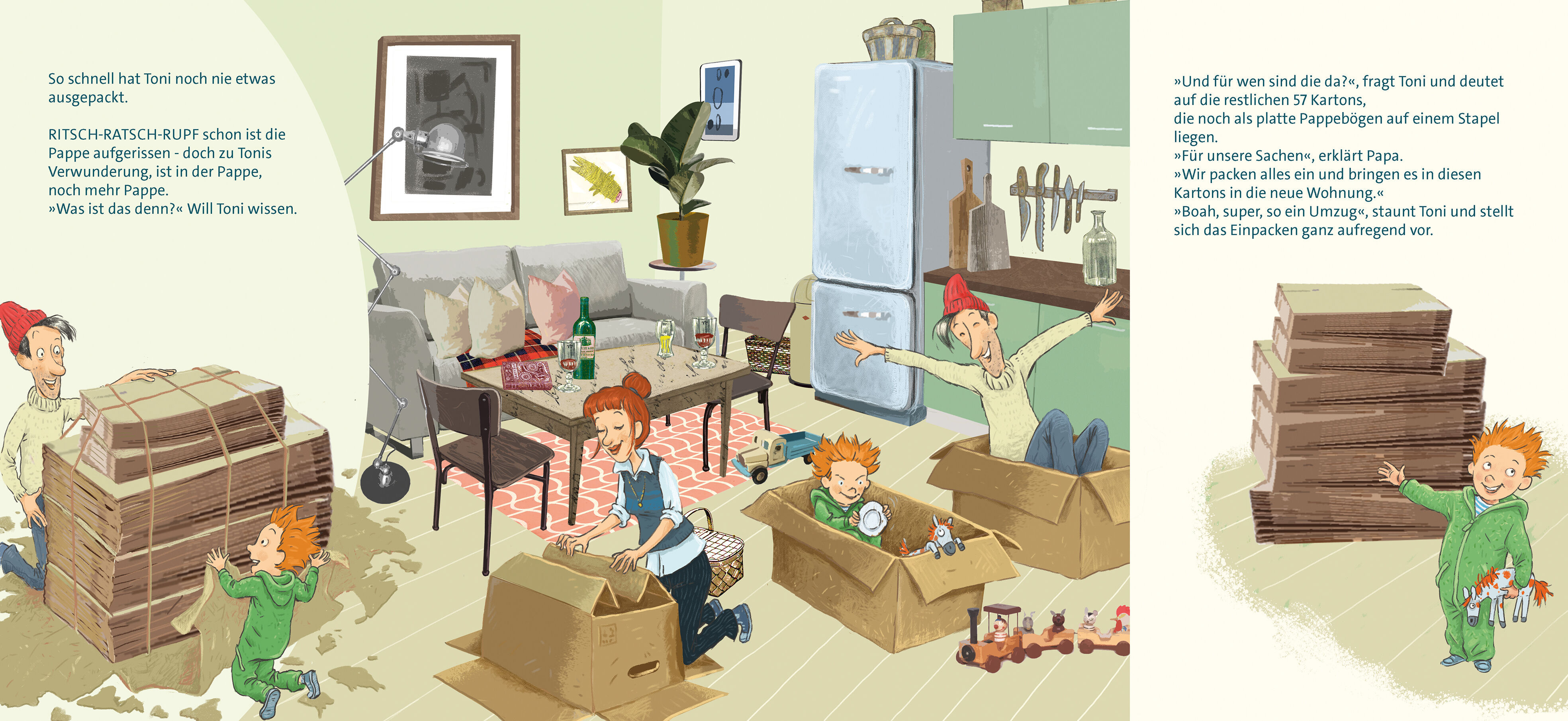 Toni schaut zu, wie sich die Wohnung Stück für Stück in eine Kistenburg verwandelt. Was kommt alles mit in die neue Wohnung? Und wovon muss man sich trennen? Geht auch sicher nicht das liebste Spielzeug verloren? Während Mama versucht, den Überblick zu behalte...
