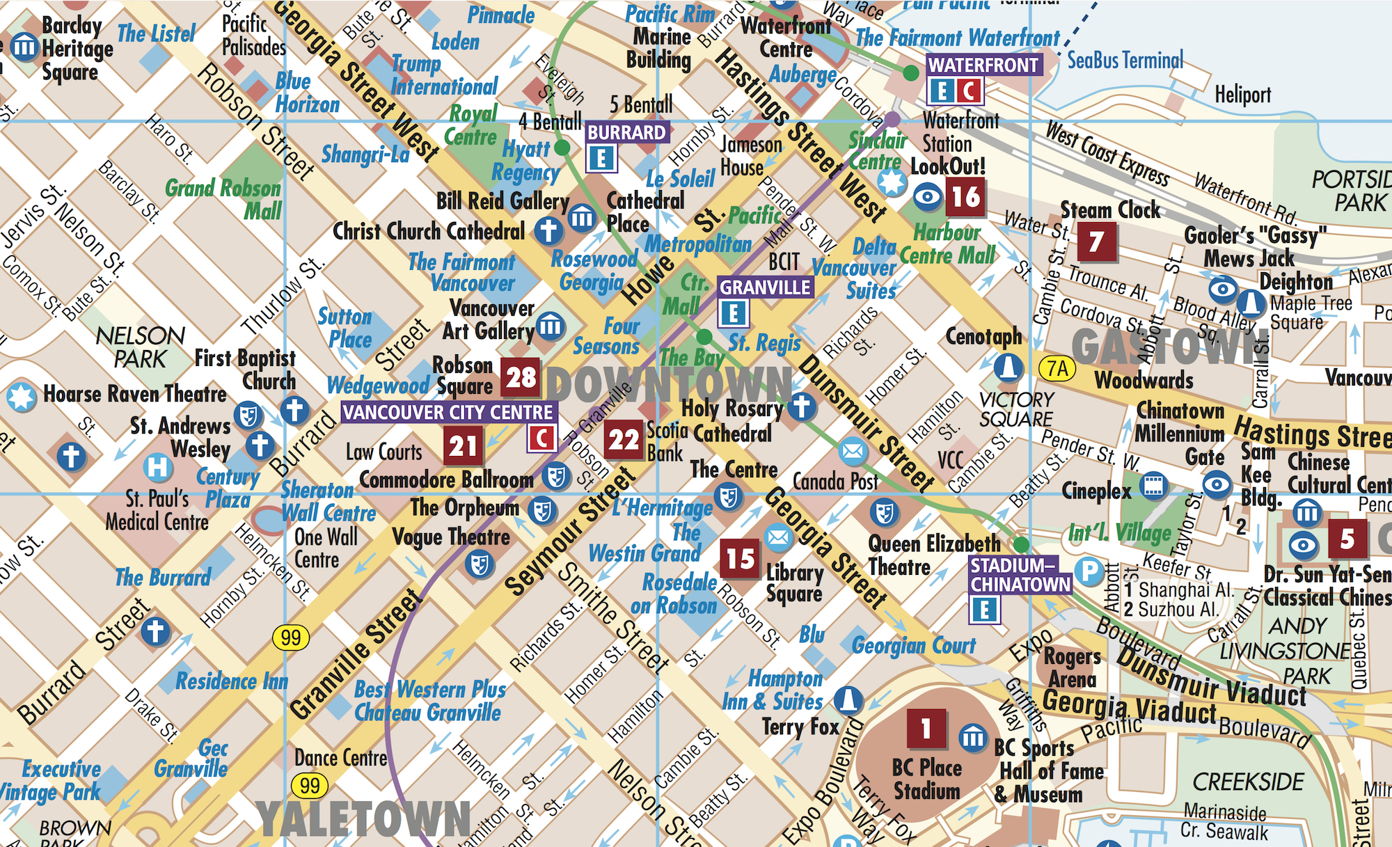 Our laminated and folded Borch Map of Vancouver in the 9th edition contains: Vancouver Downtown 1:15 000, Greater Vancouver 1:125 000, Vancouver - Seattle Area 1:1 800 000, Granville Island 1:5 500, Victoria 1:30 000, the public transport system and an adminis...
