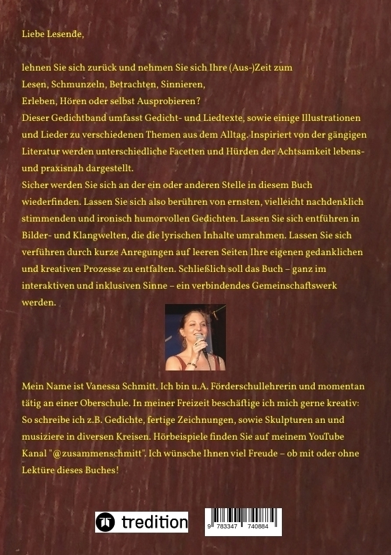 Liebe Lesende, lehnen Sie sich zurück und nehmen Sie sich Ihre (Aus-)Zeit zum Lesen, Schmunzeln, Betrachten, Sinnieren, Erleben, Hören oder selbst Ausprobieren? Dieser Gedichtband umfasst 60 Gedicht- und Liedtexte, sowie 30 Illustrationen und einige Lieder zu ...