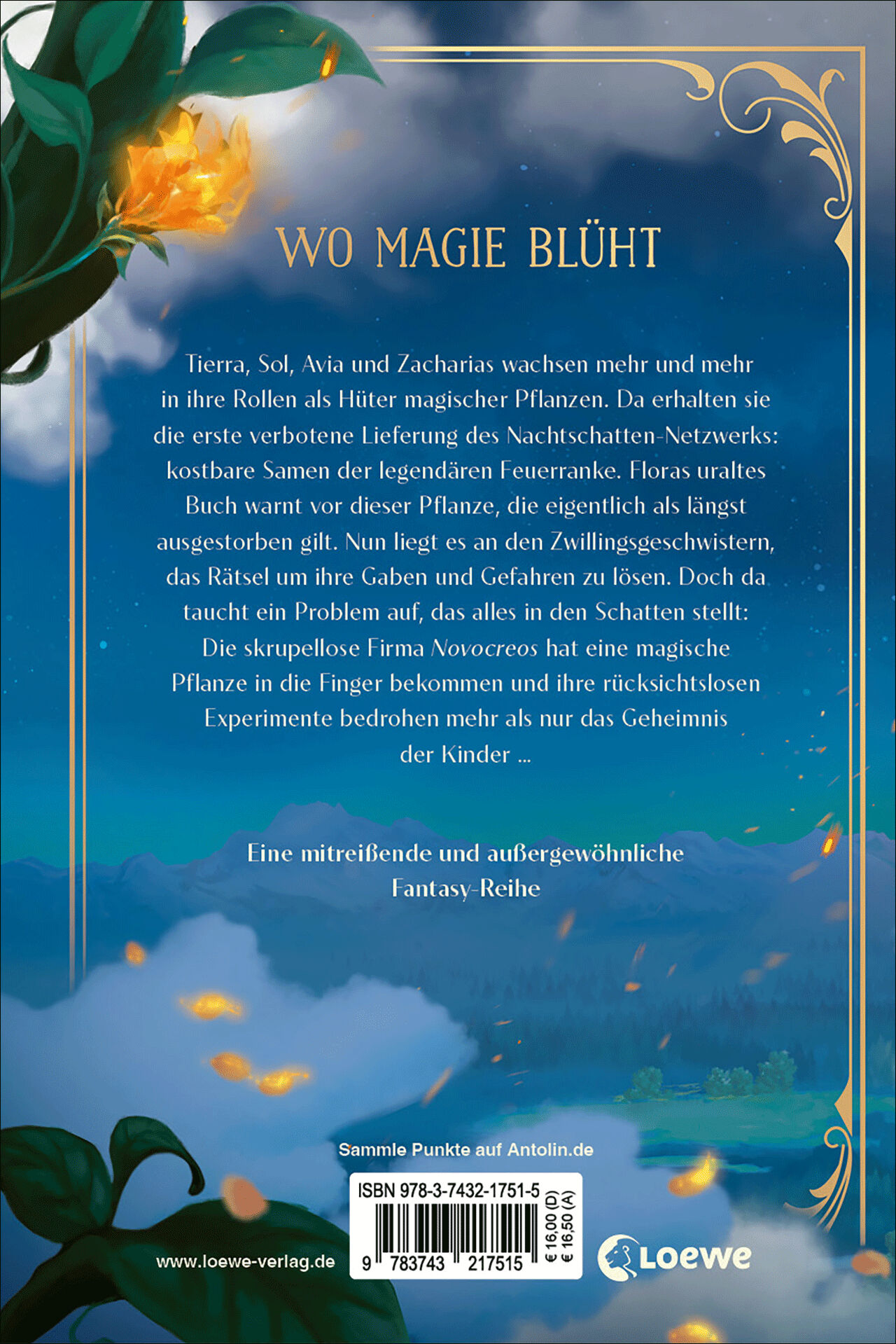 Wo Magie blüht Tierra, Sol, Avia und Zacharias wachsen mehr und mehr in ihre Rollen als Hüter magischer Pflanzen. Da erhalten sie die erste verbotene Lieferung des Nachtschatten-Netzwerks: kostbare Samen der legendären Feuerranke. Floras uraltes Buch warnt vor...