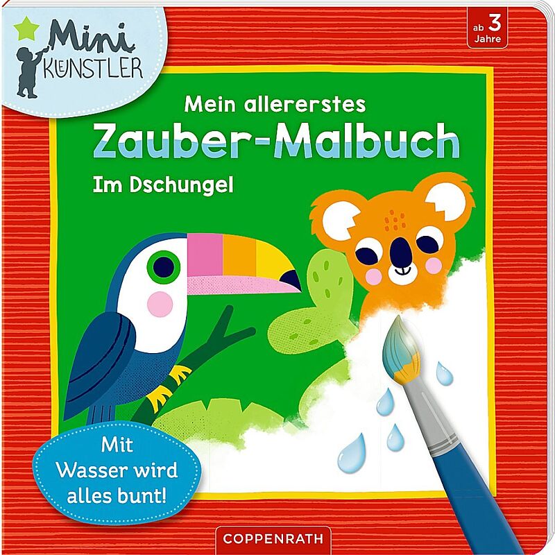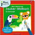 So geht's: 1. Ein Schälchen mit Wasser und einen Lappen bereitlegen. Das Buch aufschlagen. 2. Einen Finger oder einen Pinsel nass machen und damit über die weißen Flächen streichen. Schon werden die bunten Motive sichtbar. 3. Überschüssiges Wasser abwischen un...