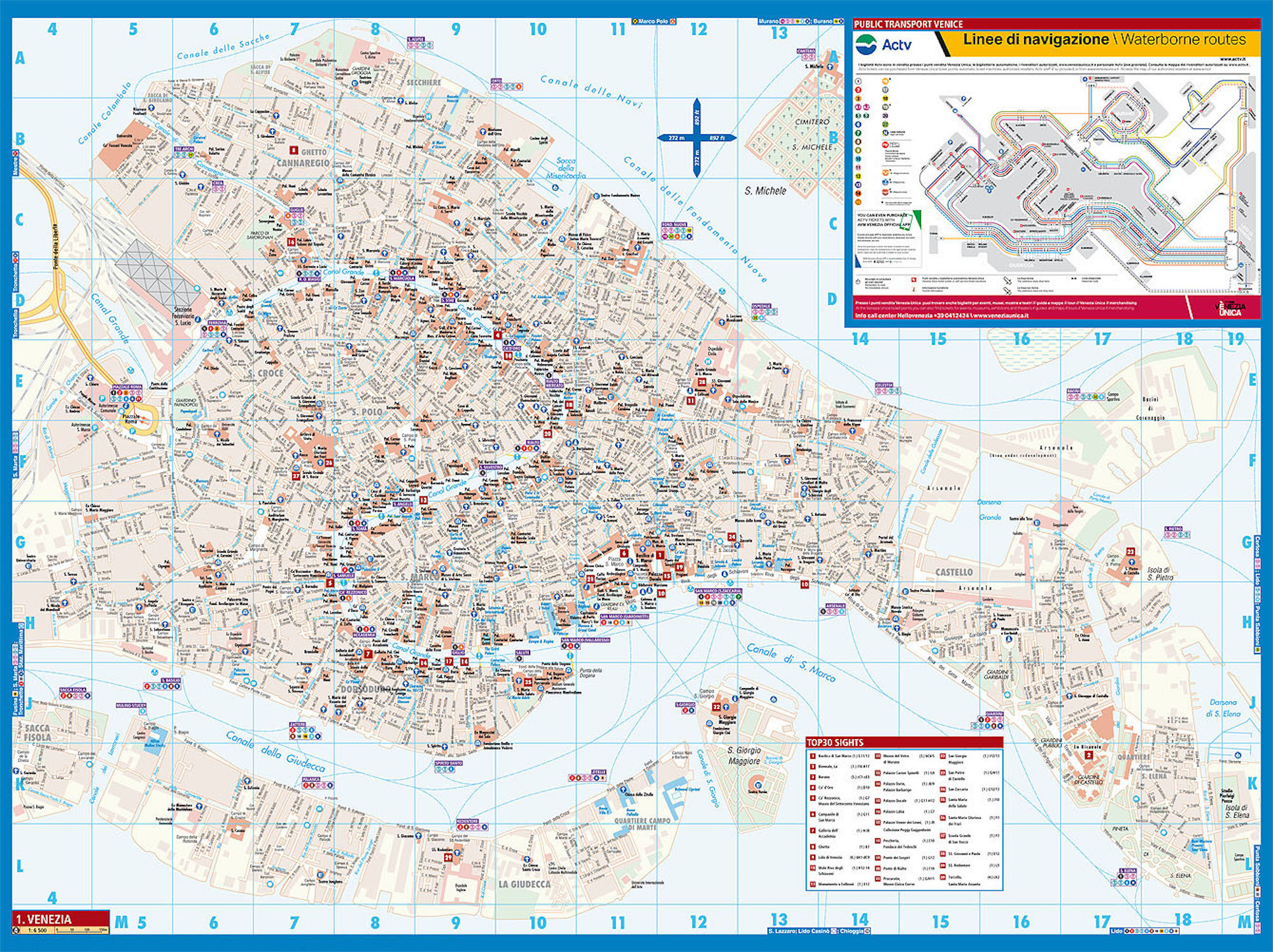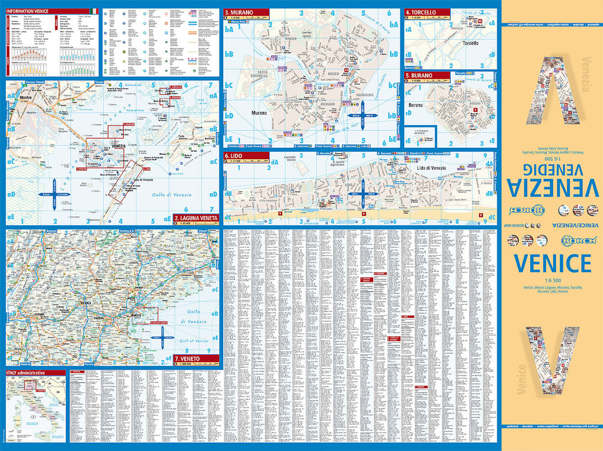 Our laminated and folded Borch Map of Venice in the 19th edition contains: Venice 1:6 500, Venice Lagoon 1:95 000, Murano 1:8 000, Torcello 1:8 000, Burano 1:8 000, Lido 1:13 500, Veneto 1:900 000, the public transport system of Waterbuses (Vaporetti)and an ad...