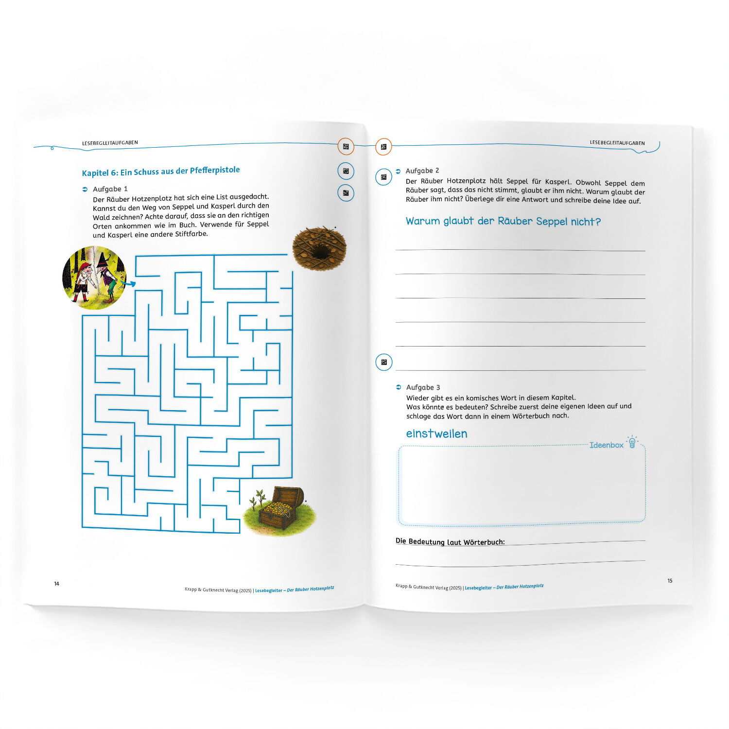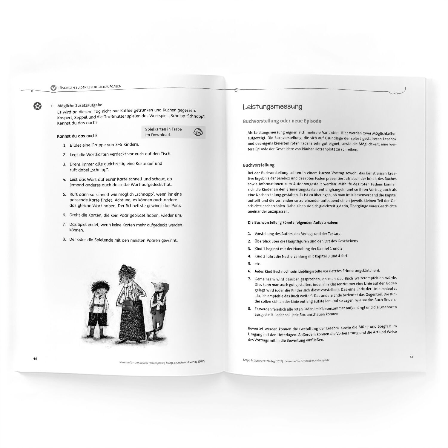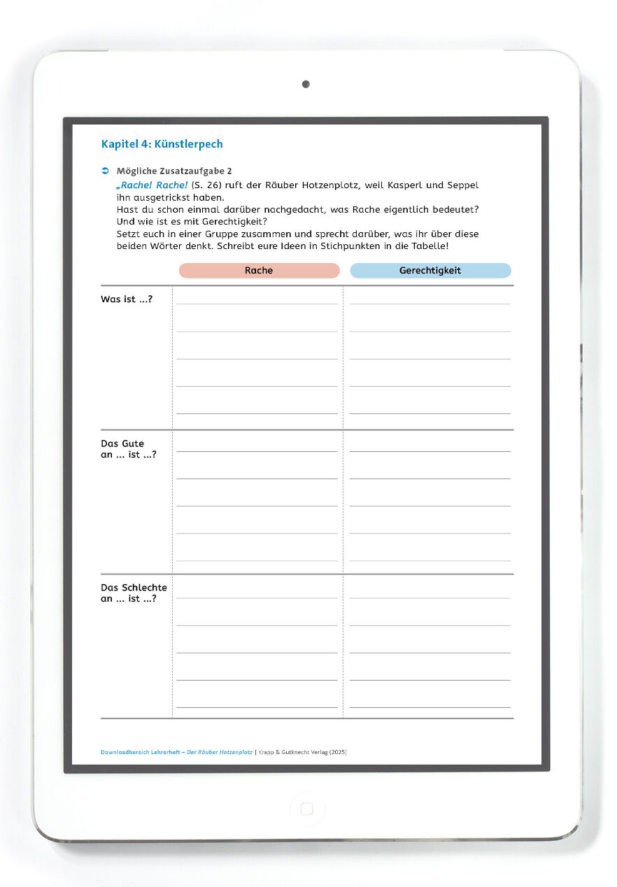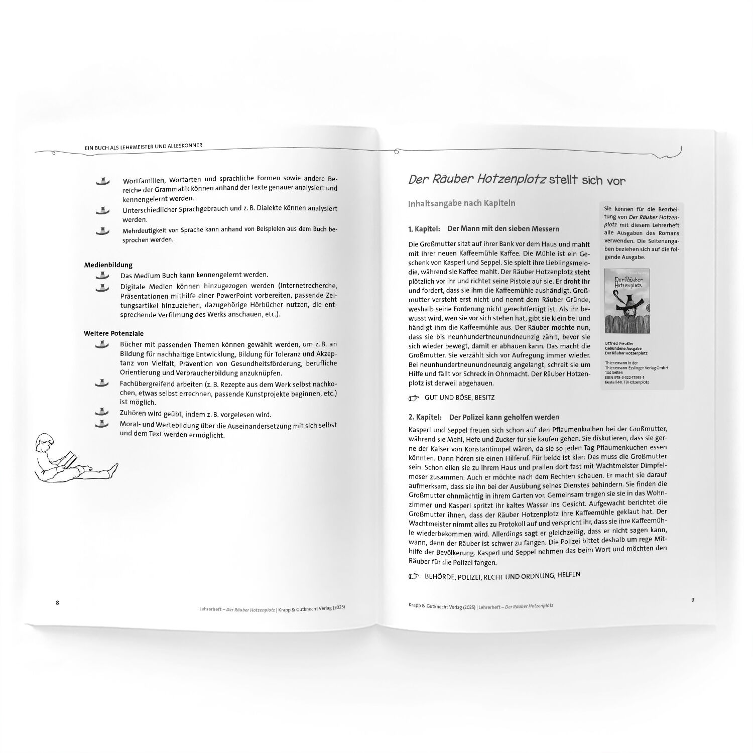 Das Lehrerheft bildet zusammen mit dem Lesebegleiter Der Räuber Hotzenplotz (ISBN: 978-3-96323-408-8) im Klassensatz und der Bastelanleitung ein umfassendes Unterrichtsmaterial. Während der Lesebegleiter kapitelweise Aufgaben für die Schülerinnen und Schüler bietet, regt die Bastelanleitung Der rote Faden: Der Räuber Hotzenplotz (ISBN: 978-3-96323-409-5) zur Gestaltung einer persönlichen Lesebox und zur kreativen Reflexion über Erinnerungskärtchen an. Diese Materialien ergänzen sich optimal und schaffen eine vielseitige, praxisnahe Leseerfahrung, die Freude und Begeisterung für das Lesen weckt.