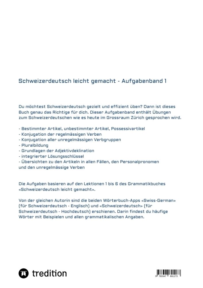 Der Aufgabenband 1 bietet zahlreiche Übungen zu den Lektionen 1 bis 6 des Grammatikbuches «Schweizerdeutsch leicht gemacht». Er umfasst Der Aufgabenband 1 bezieht sich auf den Dialekt wie er heute im Grossraum Zürich gesprochen wird und basiert auf dem Wortsch...