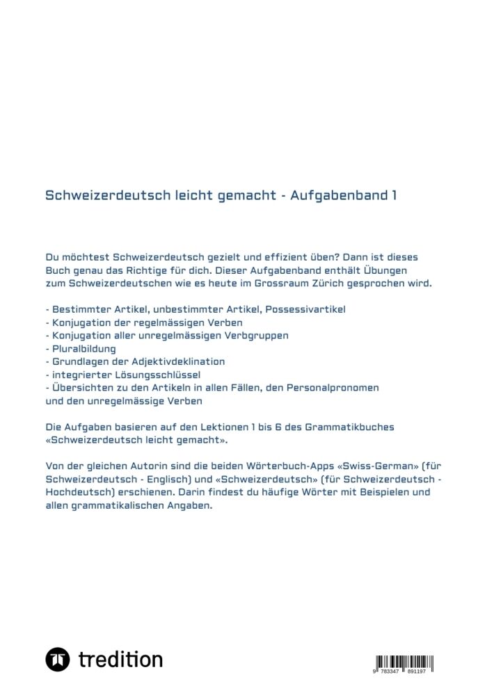 Der Aufgabenband 1 bietet zahlreiche Übungen zu den Lektionen 1 bis 6 des Grammatikbuches «Schweizerdeutsch leicht gemacht». Er umfasst Der Aufgabenband 1 bezieht sich auf den Dialekt wie er heute im Grossraum Zürich gesprochen wird und basiert auf dem Wortsch...