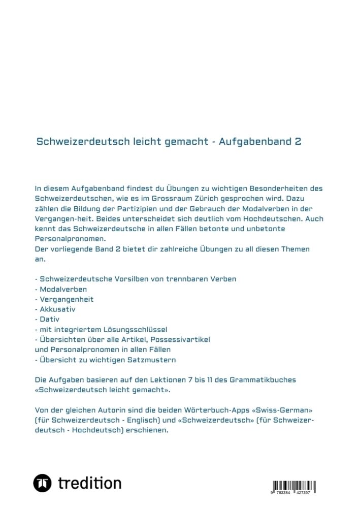 Der Aufgabenband 2 deckt die Kapitel 7 bis 11 des gleichnamigen Grammatikbuches ab. Du findest darin zahlreiche Übungen zu zentralen Eigenheiten des Dialekts wie er im Grossraum Zürich gesprochen wird. Schweizerdeutsch unterscheidet sich in zahlreichen Punkten...