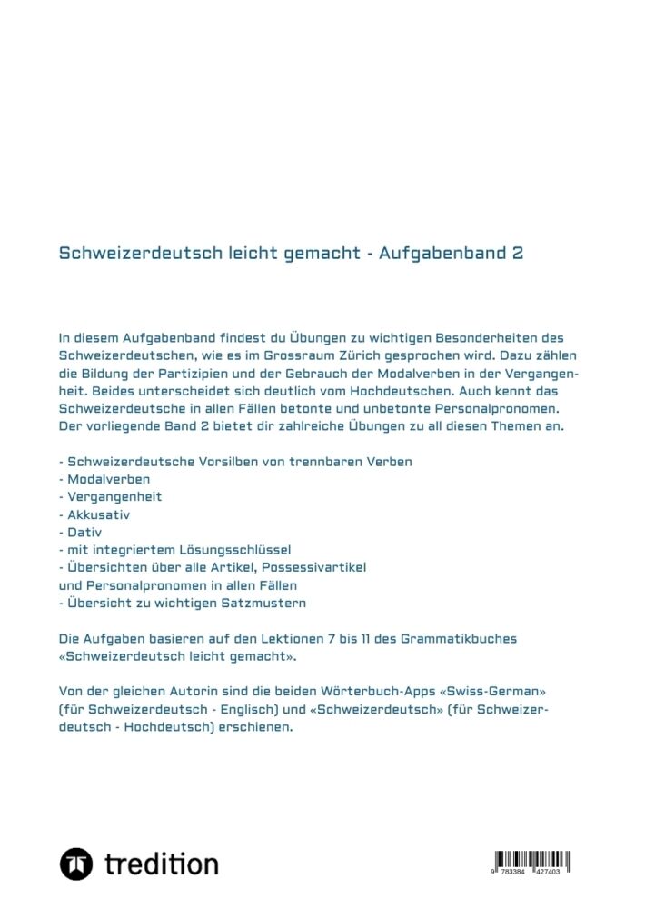 Der Aufgabenband 2 deckt die Kapitel 7 bis 11 des gleichnamigen Grammatikbuches ab. Du findest darin zahlreiche Übungen zu zentralen Eigenheiten des Dialekts wie er im Grossraum Zürich gesprochen wird. Schweizerdeutsch unterscheidet sich in zahlreichen Punkten...