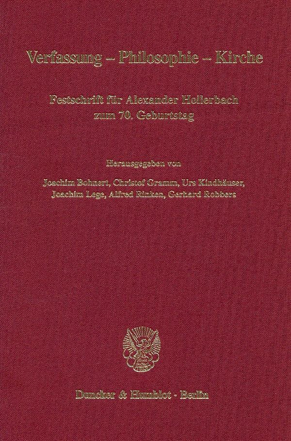 Inhalt: P. Häberle, "Wahrheitsprobleme im Verfassungsstaat"; eine Zwischenbilanz - H. Kuriki, Zum Gebrauch des Wortes "Menschenrechte" in der Geschichte der deutschen Rechts- und Staatsrechtslehre - M. Stolleis, Die Prinzessin als Braut - P. Landau, Max v. Seydel: Bayerns Staatsrechtslehrer im Bismarckreich - J. Wieland, Die Entstehung der deutschen Nationalsymbole - K. Muscheler, Entstehungsgeschichte und Auslegung von Gesetzen in der Rechtsprechung des Bundesgerichtshofs - M. Bullinger, Die Verfassungsgarantie des Rundfunks im digitalen Zeitalter - F. Schoch, Die Grundrechtsdogmatik vor den Herausforderungen einer multikonfessionellen Gesellschaft - J. Schwarze, Die Wahrung des Rechts als Aufgabe und Verantwortlichkeit des Europäischen Gerichtshofs - R. Wahl, Internationalisierung des Staates - T. Würtenberger, Auslegung von Verfassungsrecht; realistisch betrachtet - J. Isensee, Die alten Grundrechte und die biotechnische Revolution. Verfassungsperspektiven nach der Entschlüsselung des Humangenoms - A. Krämer, Kritisches zur Reform der Revision in Zivilsachen - C. Kirchberg, Anwaltliches Berufsrecht und Verfassungsrecht. Entwicklungen und Perspektiven - U.-J. Pak, Der Rechtsbegriff und der Richter - S. Kirste, Dezentrierung, Überforderung und dialektische Konstruktion der Rechtsperson - A. von Bogdandy, Demokratisch, demokratischer, am demokratischsten? Zur Steigerungsfähigkeit eines Verfassungsprinzips am Beispiel einer Neugestaltung der Verordnungsgebung - J. Lege, Das Öffentliche, das Private und das Soziale. Zugleich ein Beitrag zum Telekommunikationsrecht - A. Rinken, Volksgesetzgebung und Verfassung - H. Hofmann, Das Politische in Spinozas "Politischem Traktat" - H.-P. Schneider, Recht und Denken. Erinnerungen an Erik Wolf und Martin Heidegger - C. Choi, Gustav Radbruch und Ostasien - C. Vulpius, "Zweckmäßigkeit" und "Gemeinwohl" bei Radbruch - W. Brugger, Freiheit, Repräsentation, Integration. Zur Konzeption politischer Einheitsbildung in den "Federal Papers" - C. Enders, Menschenrechtsidee und staatliche Grundrechtsgewährleistung: ein unauflösbarer Widerspruch? Das Naturrechtsproblem nach 50 Jahren Grundgesetz - M. Paroussis, Chaosforschung und Recht - C. Bittner, Rentenversicherungsrechtlicher Generationenvertrag als Gesellschaftsvertrag (Sozialkontrakt)? - J. Bohnert, Über Profanierung - C. Gramm, Verrechtlichung von Ethik und Ethisierung des Rechts - U. Kindhäuser, Handlungs- und normtheoretische Grundfragen der Mittäterschaft - M. Heckel, Das Bekenntnis: ein Vexierbild des Staatskirchenrechts? - W. Rüfner, Staatskirchenrecht im pluralistischen Staat. Wertungsdifferenzen zwischen Staat und Religionsgemeinschaften - A. Janssen, Staatskirchenrecht als Kollisionsrecht. Überlegungen zur Auslegung der Artikel 140 GG / 137 Abs. 5 WRV - H. Maier, Kurze Geschichte des Schulfachs Ethik - C. Link, "LER". Religionsunterricht und das deutsche Staatskirchenrecht - G. Göbel, Der Kampf um die Schule. Religiöse Präsenz an staatlichen Schulen in der Rechtsprechung des Bundesverfassungsgerichts - E.-L. Solte, Kirche, Staat und evangelische Theologie - D. Ehlers, Die Rechtmäßigkeit des Verbots kirchlicher Voraustrauungen - J. Jurina, Staatliche Einflussnahme auf die kirchliche Vermögensverwaltung - K.-H. Kästner, Gesetzliche Beendigung des Dienstverhältnisses evangelischer Pfarrer oder Kirchenbeamter nach rechtskräftiger Verurteilung - F. Messner, Die aktuellen Entwicklungen des Lokalrechts bezüglich der Religionsgemeinschaften in Elsaß-Moselle - H. Marré, Kooperation von Staat und Kirche und staatliche Kirchenförderung; vorbildhaft für Europa - J. Winter, Das Verhältnis von Staat und Kirche als Ausdruck der kulturellen Identität der Mitgliedstaaten der Europäischen Union - G. Robbers, Kirche und Staat in Schweden
