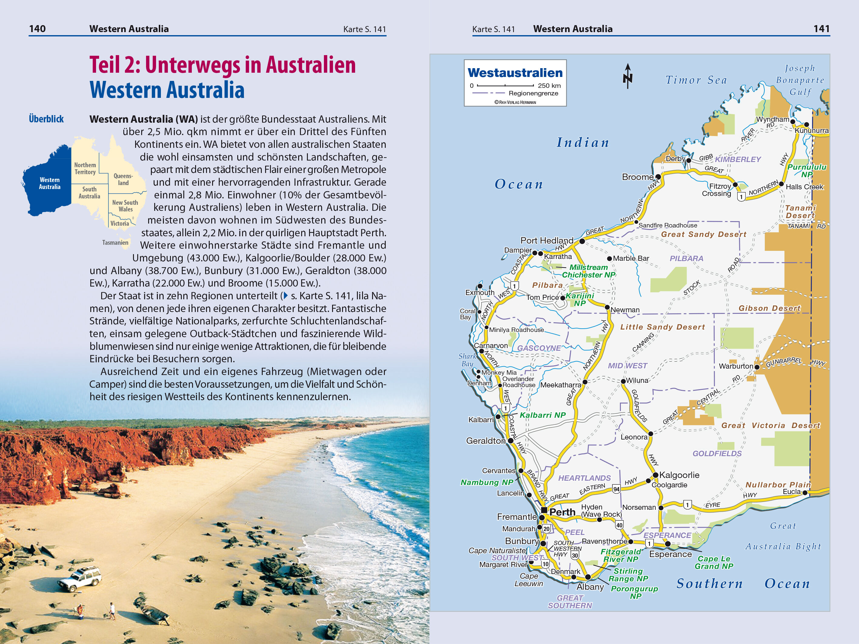 Der Westen und das Zentrum Australiens wild, weit und voller Abenteuer Der Westen des australischen Kontinents zeichnet sich durch viele Sonnenstunden, grenzenlose Weiten und eine kontrastreiche Natur aus: tiefrotes Outback mit Jahrmillionen alten Felsformati...