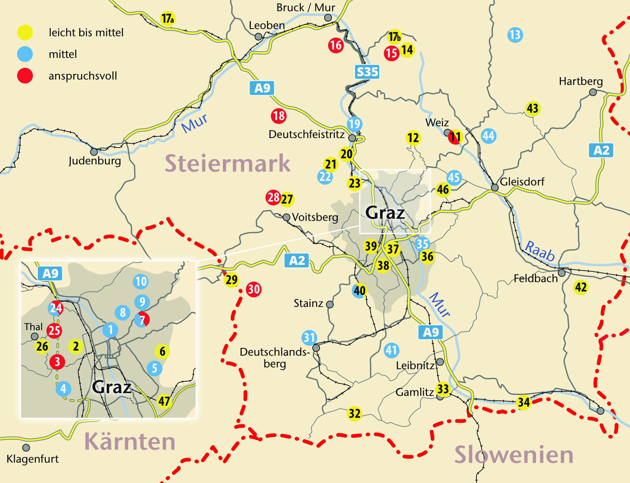 Die Stadt Graz und ihre umgebneden Regionen bieten viele versteckte Kleinode und wunderbare Erholungswege. Ob über Weinberge, entlang von Kulturpfaden, ins Grazer Bergland oder auf den Schöckl. Die hier gesammelten Wege zählen zu den schönsten der Regionen. Mi...