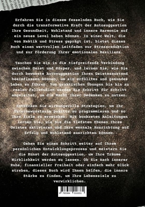 "Erfahren Sie in diesem fesselnden Buch, wie Sie durch die transformative Kraft der Autosuggestion Ihre Gesundheit, Wohlstand und innere Harmonie auf ein neues Level heben können. In einer Welt, die von Hektik und Stress geprägt ist, bietet dieses Buch einen w...