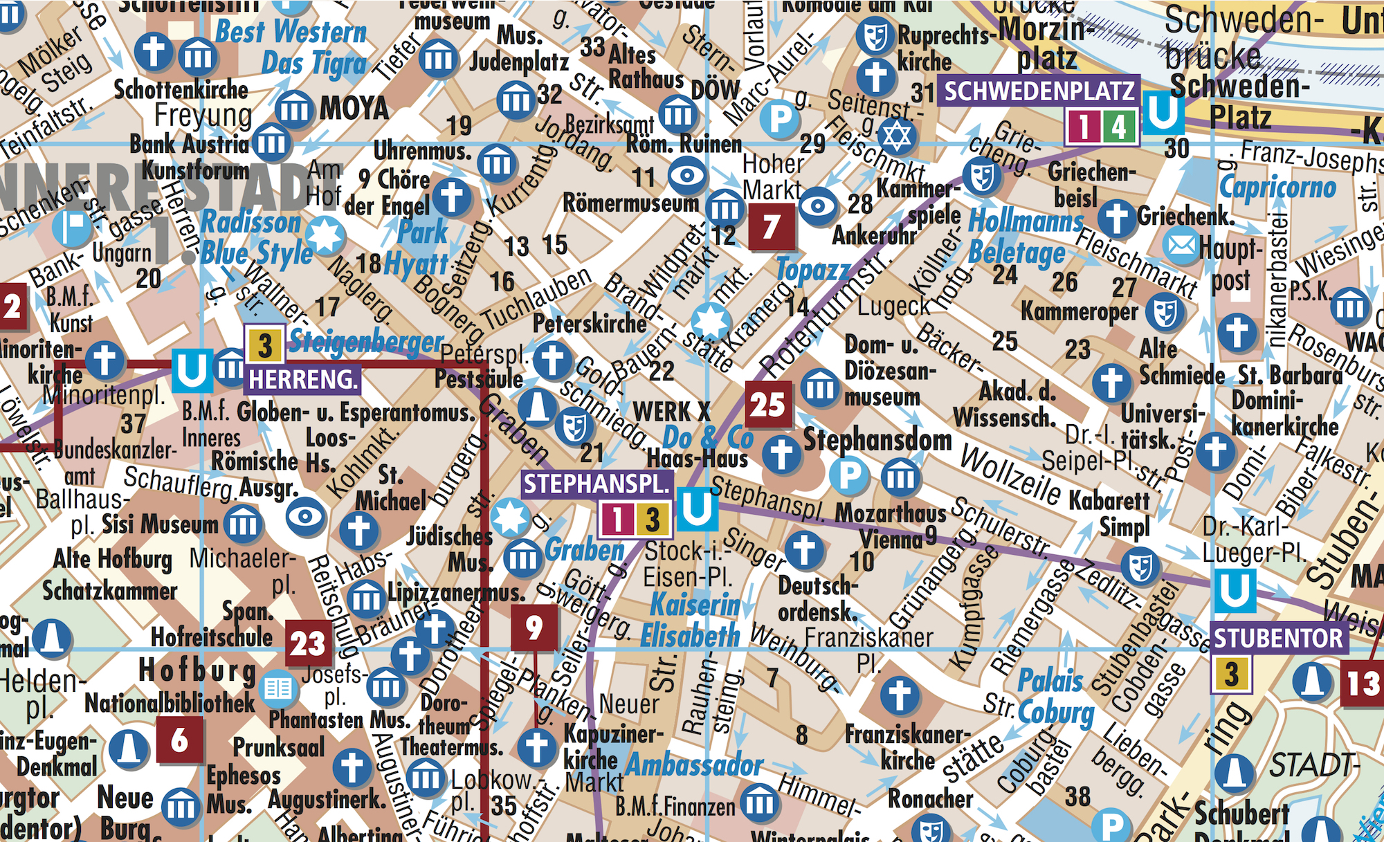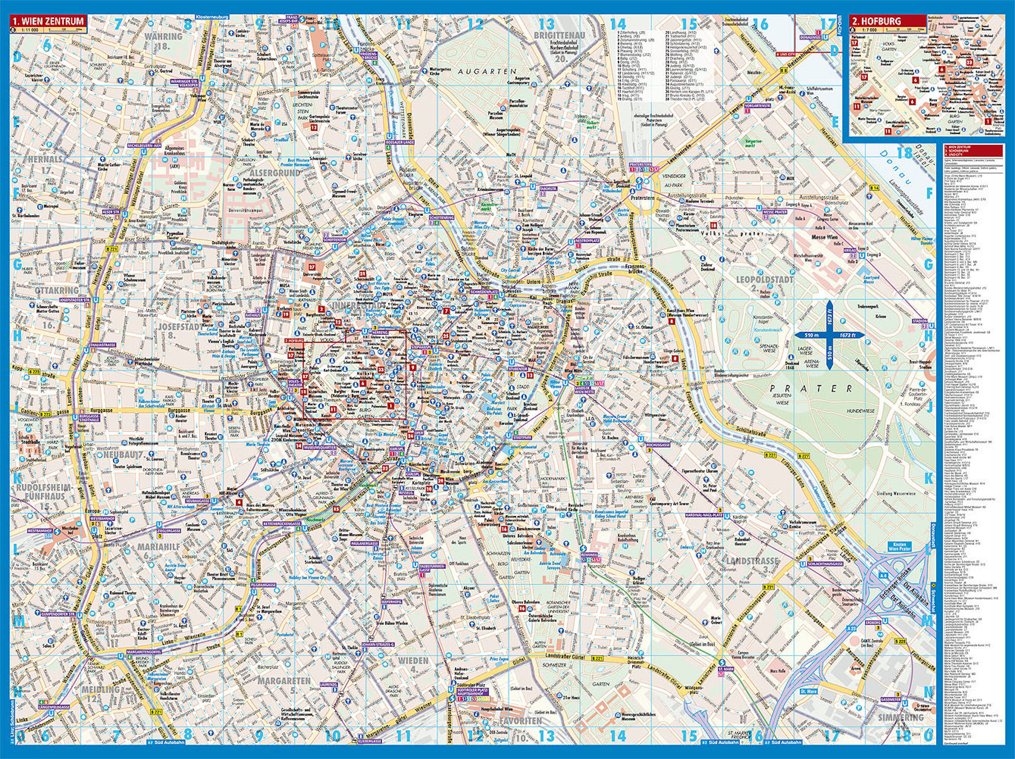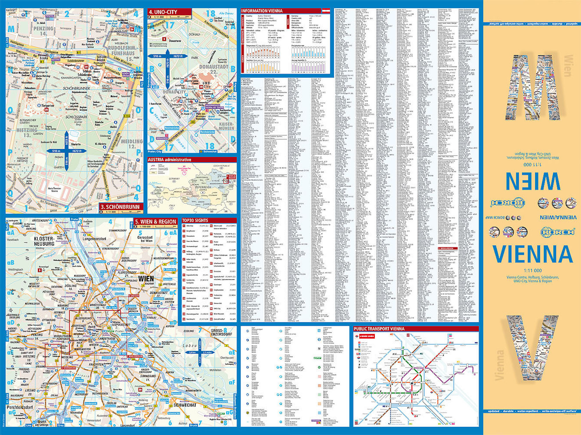 Folienbeschichteter Stadtplans der österreichischen Hauptstadt mit einer Übersichtskarte von Wien, einem Plan des öffentlichen Nahverkehrsnetzes und Nebenkarten zu Schönbrunn, der Hofburg und der UNO City sowie einem umfangreichen Register zu Straßen, Parks, H...