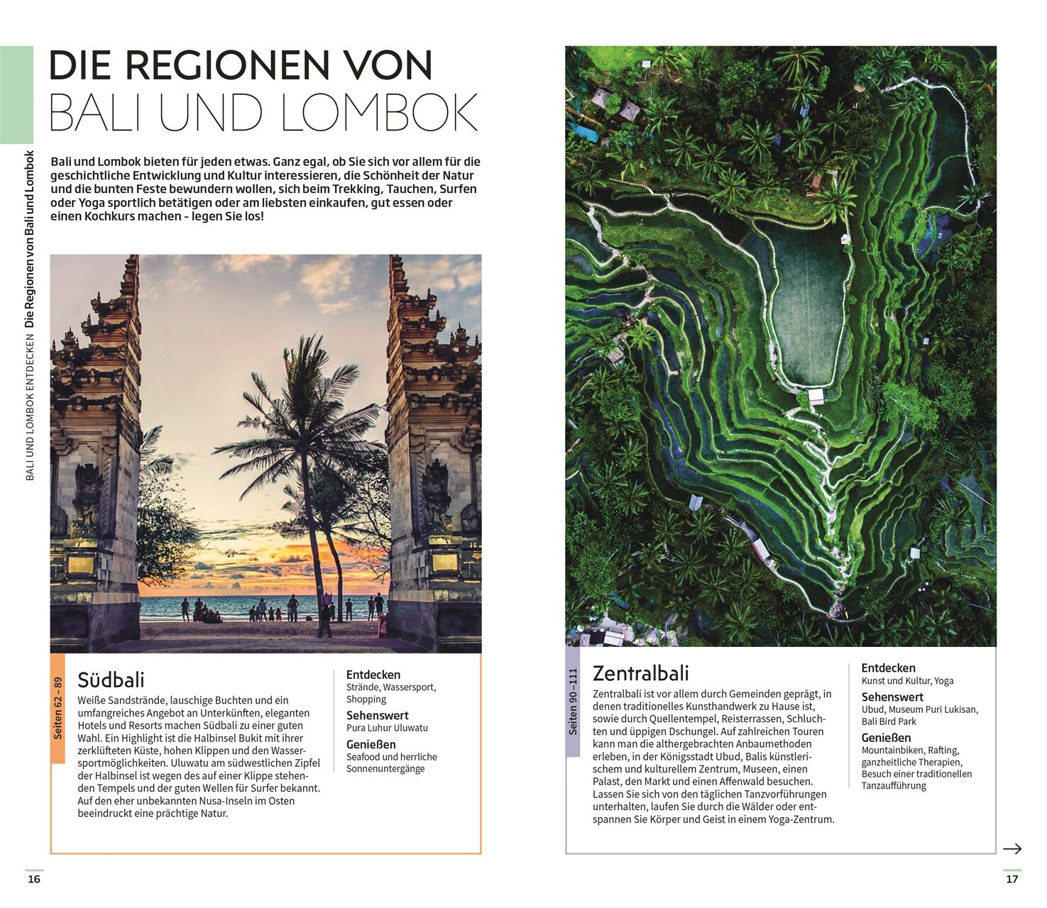 • Die schönsten Regionen: Die fabelhaftesten Gegenden stellen sich Ihnen im Reiseführer Bali & Lombok Insel für Insel und Region für Region in ihrer gesamten Pracht vor mit fundierten und qualitativen Inhalten sowie unvergesslichen Highlights aus Kultur und Alltag: Von der wenig besuchten Region Nord- und Westbali mit schwarzen Sandstränden, spektakulären Wasserfällen und Regenwäldern über Zentralbali mit seinen grünen Reisterrassen und der Künstlerstadt Ubud bis zum friedvollen Ostbali, das mit seinen ruhigen Stränden eine erholsame Alternative zum Trubel der Touristenzentren ist. Nicht zu vergessen Südbali, das für gute Wellen für Surfer bekannt ist.