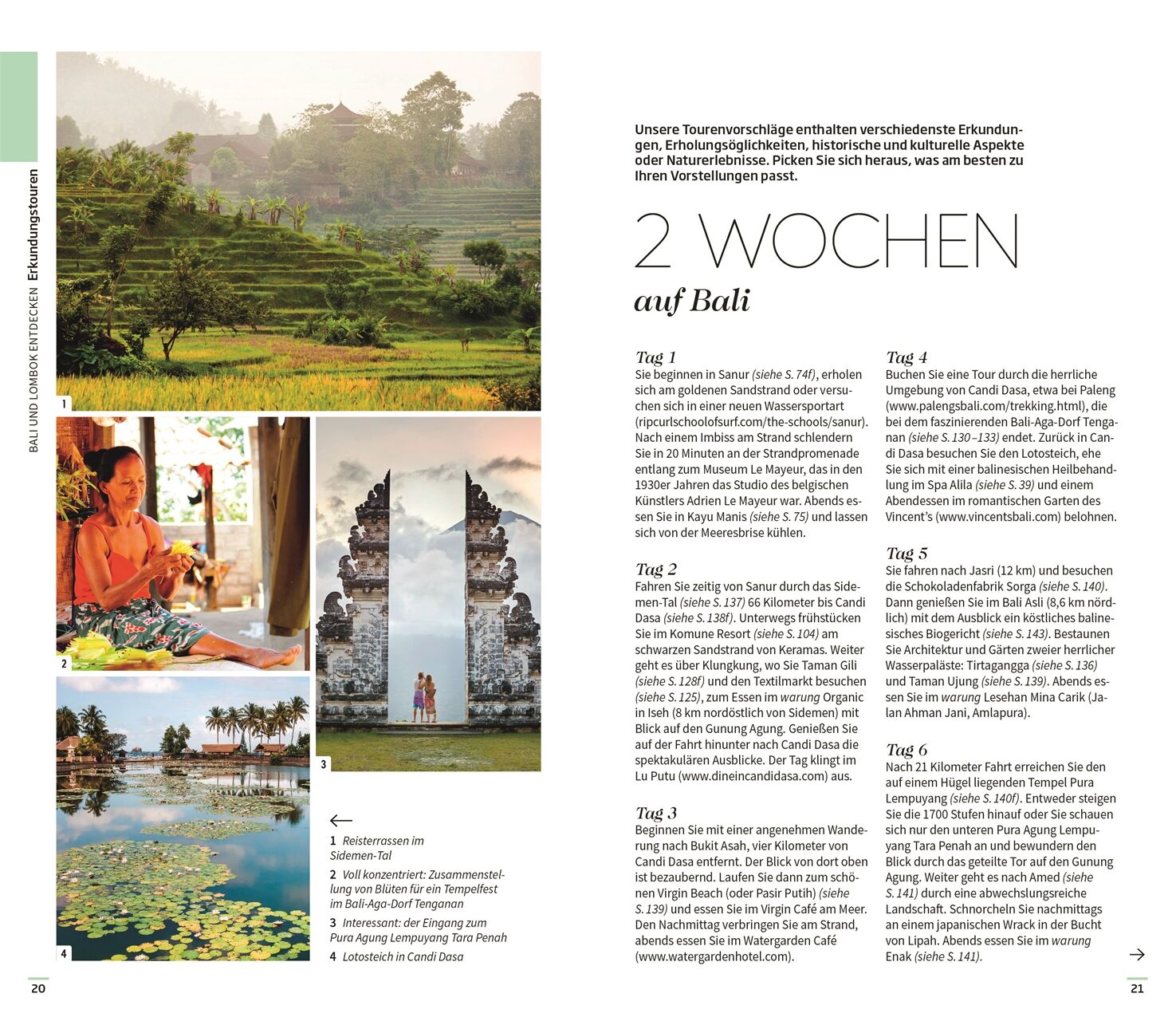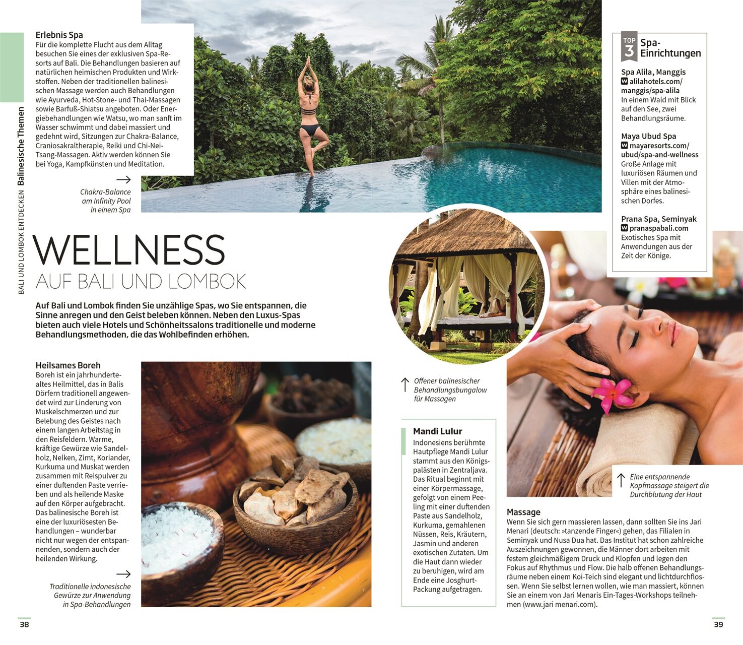 • Ausgewählte Top-Themen: Auf den bildgewaltigen Themenseiten des Bali & Lombok-Reiseführers stehen charakteristische Besonderheiten im Fokus. Erkunden Sie die umfangreichen Wellness-Möglichkeiten Balis mit der traditionellen balinesischen Massage oder dem umfangreichen Yoga-Angebot, lernen Sie das überall zu findende Kunsthandwerk kennen, das einen hohen Stellenwert auf Bali und Lombok einnimmt oder erhalten Sie Einblick in die indonesische Küche, mit vielen frisch gemahlenen und raffiniert gemischten Gewürzen.