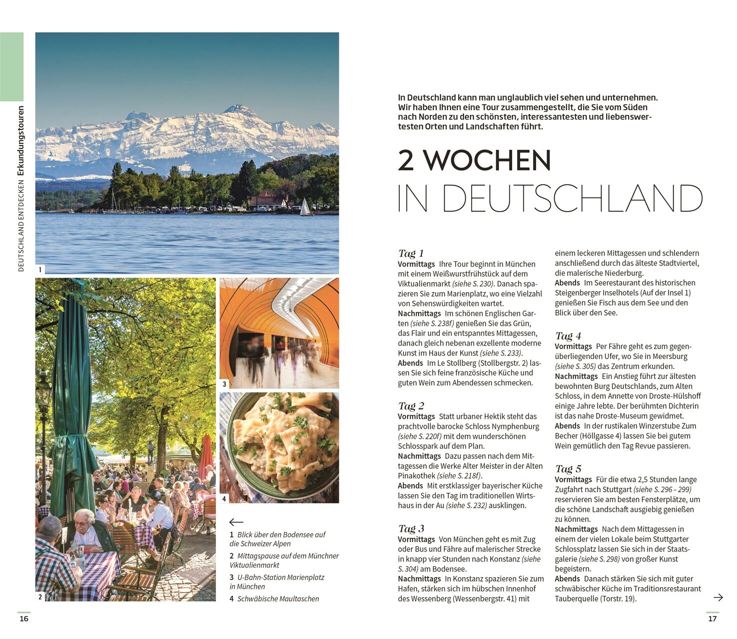 • Das Beste für Ihren Urlaub in Deutschland: Egal ob ein Wochenende, eine Woche oder länger eine Deutschland-Reise lohnt sich! Für alle, die nur wenig Zeit haben, das Land zu erkunden, gibt es facettenreiche Vorschläge, um das Beste aus ihrem Trip herauszuholen. So lernen Sie in 14 Tagen auf einer Fahrt von Süd nach Nord nicht nur das gemütliche München und quirlige Berlin kennen, Sie fahren auf malerischen Strecken zum Beispiel nach Konstanz am Bodensee, besuchen die älteste bewohnte Burg Deutschlands in Meersburg, entdecken weltbekannte Kunstschätze in Stuttgart, bewundern historische Bauten in Düsseldorf und Bremen und lernen dabei die unterschiedlichen regionalen Köstlichkeiten der deutschen Küche kennen.