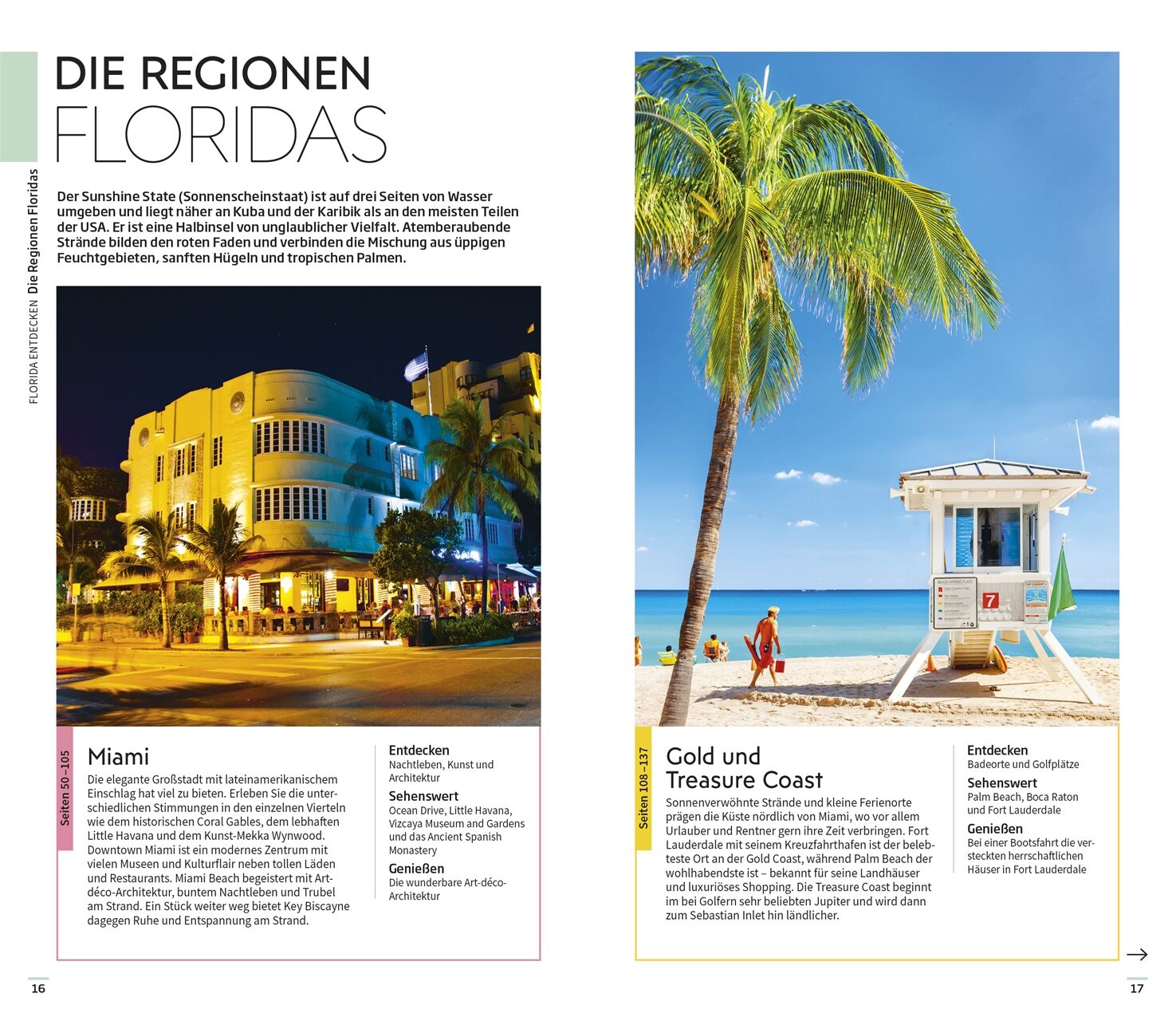 • Ausgewählte Top-Themen: Auf den bildgewaltigen Themenseiten des Florida-Reiseführers stehen charakteristische Besonderheiten im Fokus. Entdecken Sie Floridas traumhafte Strände, technologisch fortschrittlichste Themenparks oder die vielfältige Kultur des Sunshine-States. Auch Outdoor-Fans, Naturliebhaber und Foodies kommen hier voll auf ihre Kosten.