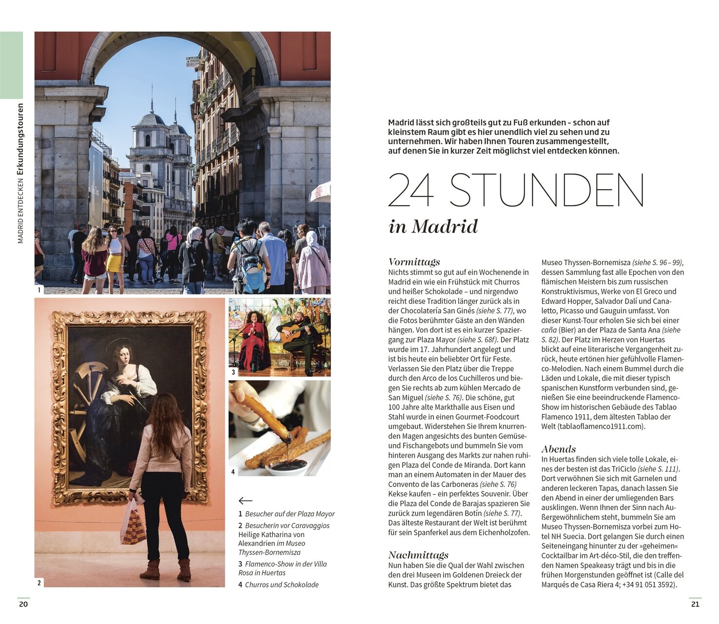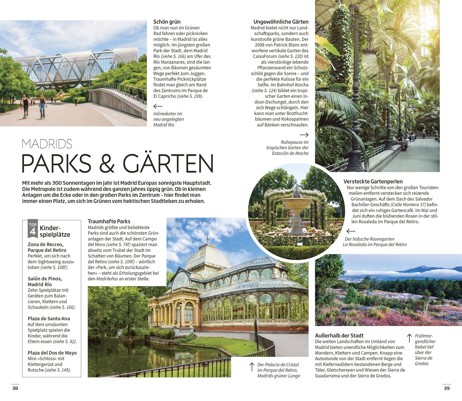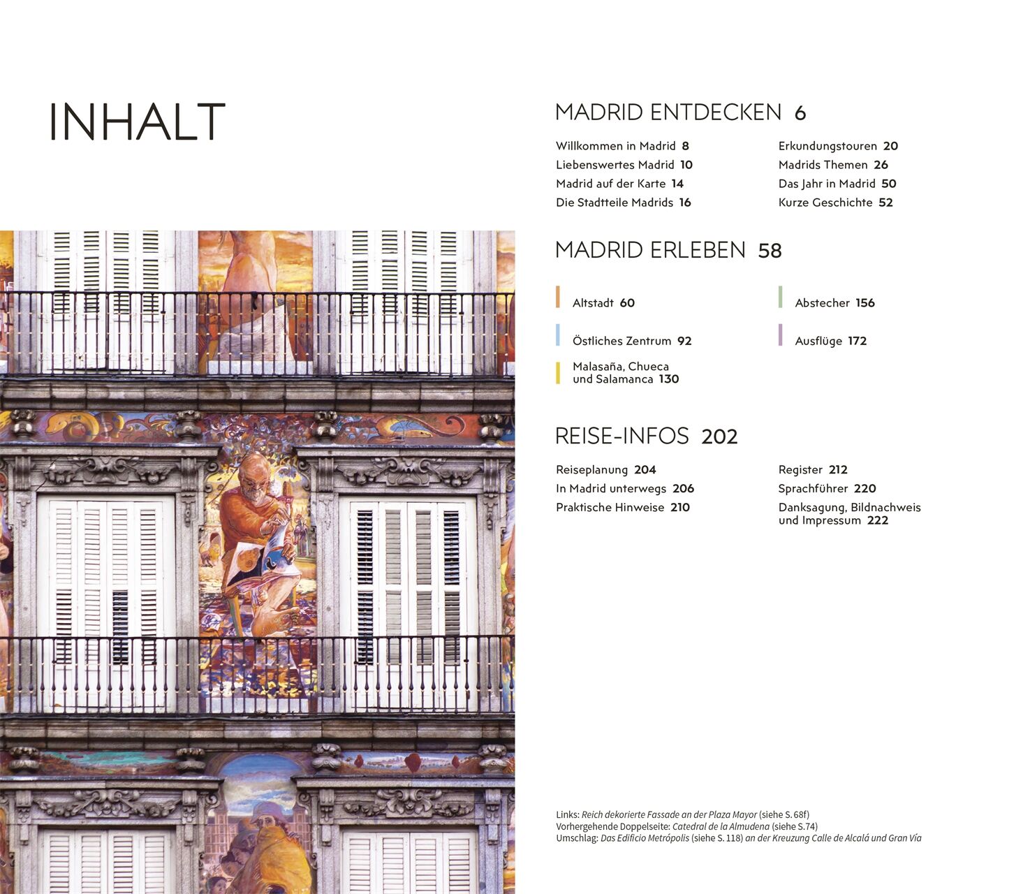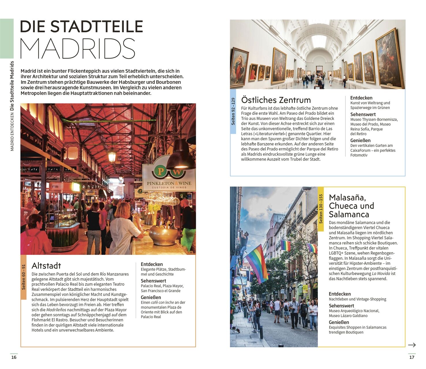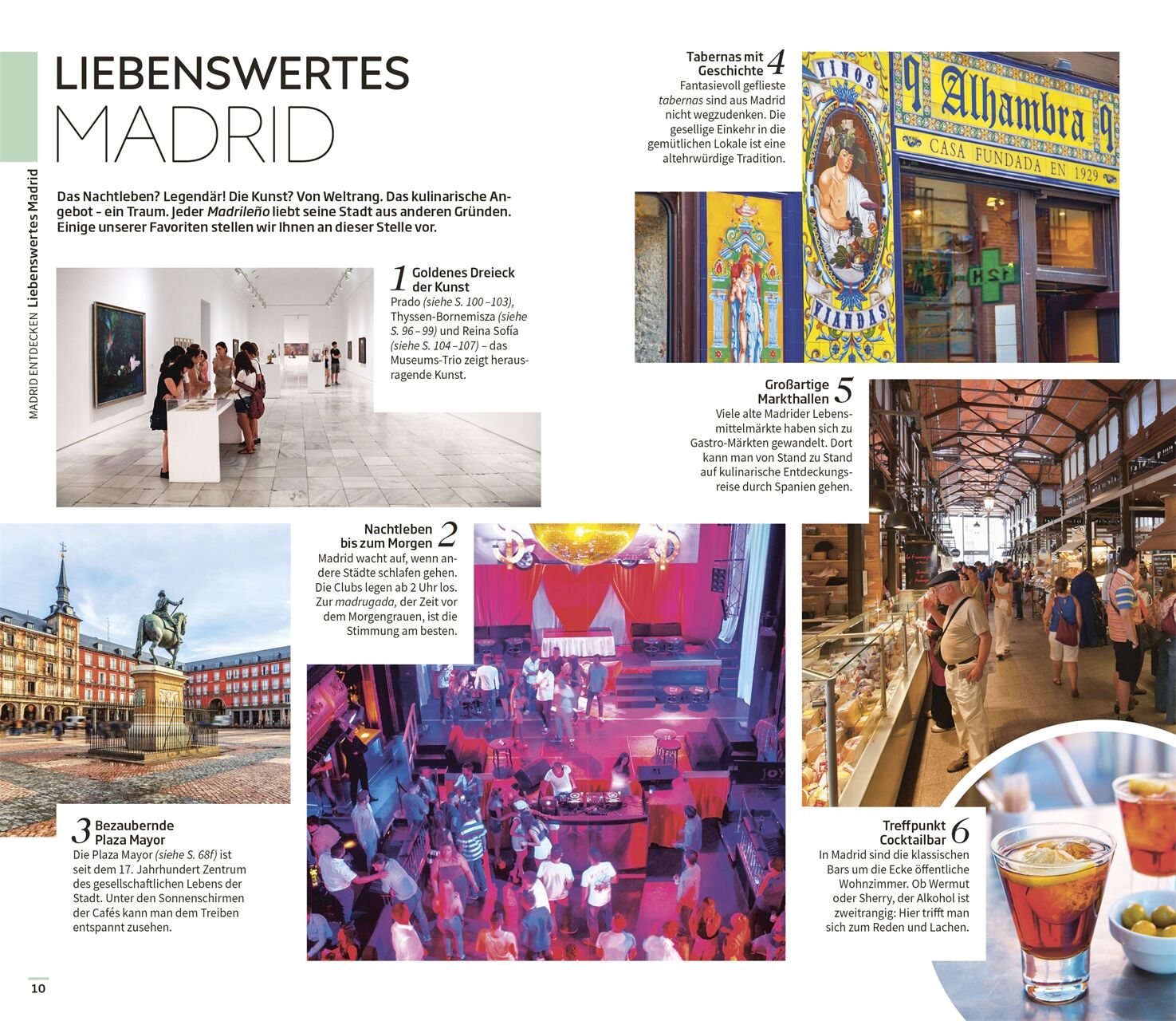 • Ausgewählte Top-Themen: Auf den bildgewaltigen Themenseiten des Madrid-Reiseführers stehen charakteristische Besonderheiten im Fokus. Entdecken Sie Madrids einzigartige Architektur, traditionelle Unterhaltung oder das quirlige Nachtleben. Auch Kunstliebhaber, Film- und Fotobegeisterte, Bücherwürmer, Foodies und Shopping-Fans kommen hier auf ihre Kosten.