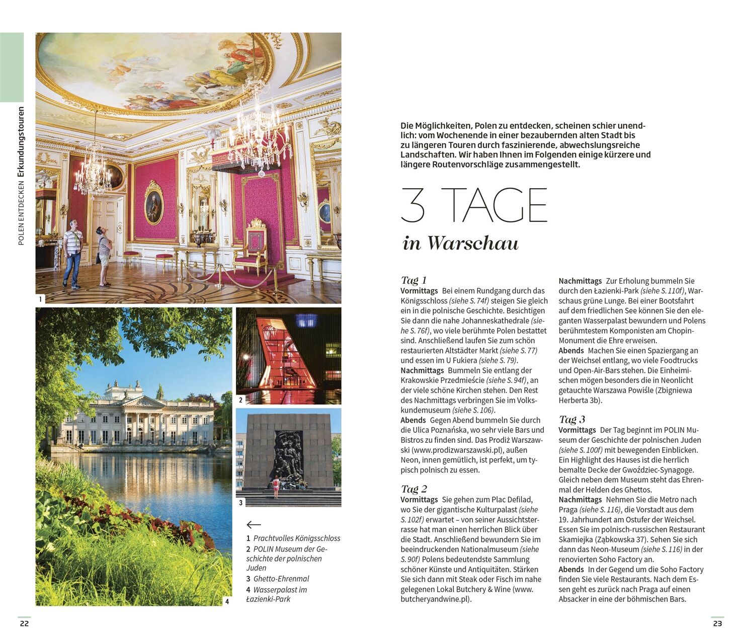 Egal ob ein Wochenende, eine Woche oder länger eine Reise nach Polen lohnt sich! Ob Sie wenig oder viel Zeit haben, das Land zu erkunden: In diesem Reiseführer finden Sie facettenreiche Vorschläge, um das Beste aus Ihrem Trip herauszuholen. So lernen Sie beispielsweise in jeweils drei Tagen die Highlights der geschichtsträchtigen Städte Danzig, Krakau oder Warschau kennen. Eine zweiwöchige Rundtour führt Sie vom Start- und Zielpunkt Warschau quer durch das Land, Sie entdecken dabei traumhafte Landschaften und Städte wie Danzig, Breslau, Posen oder Krakau.
