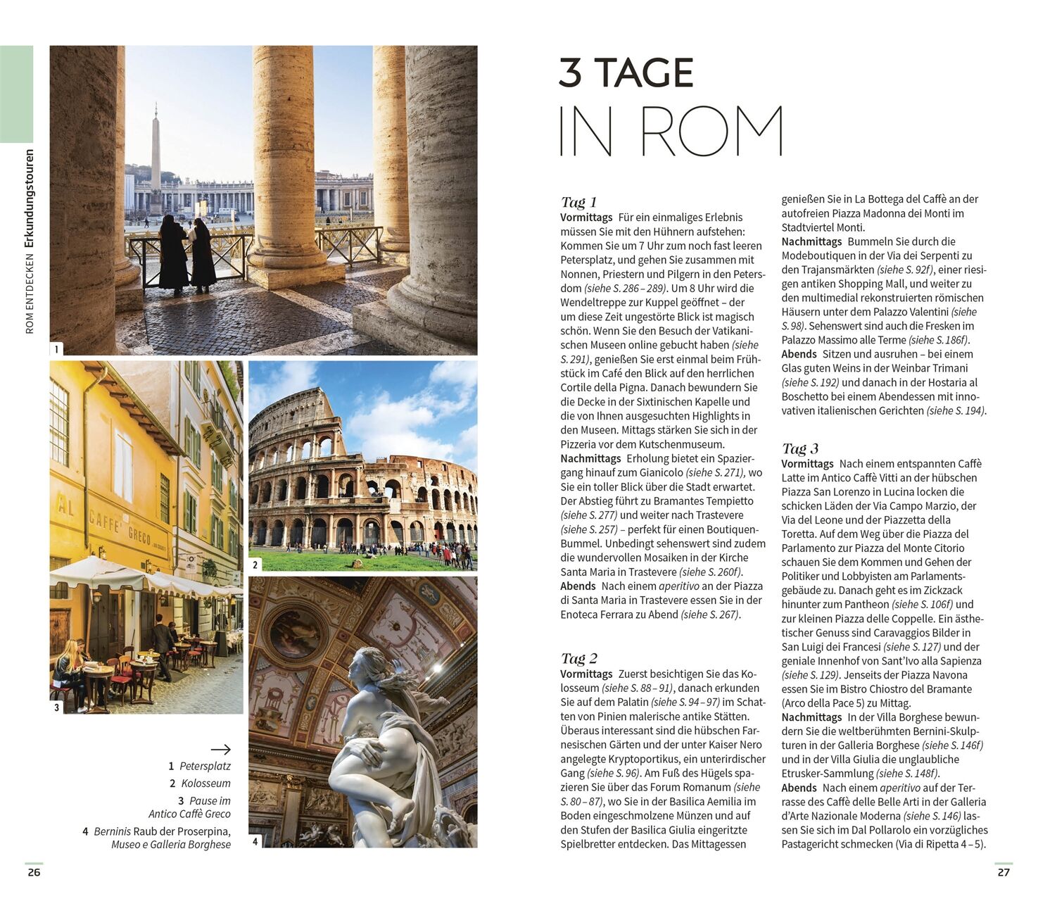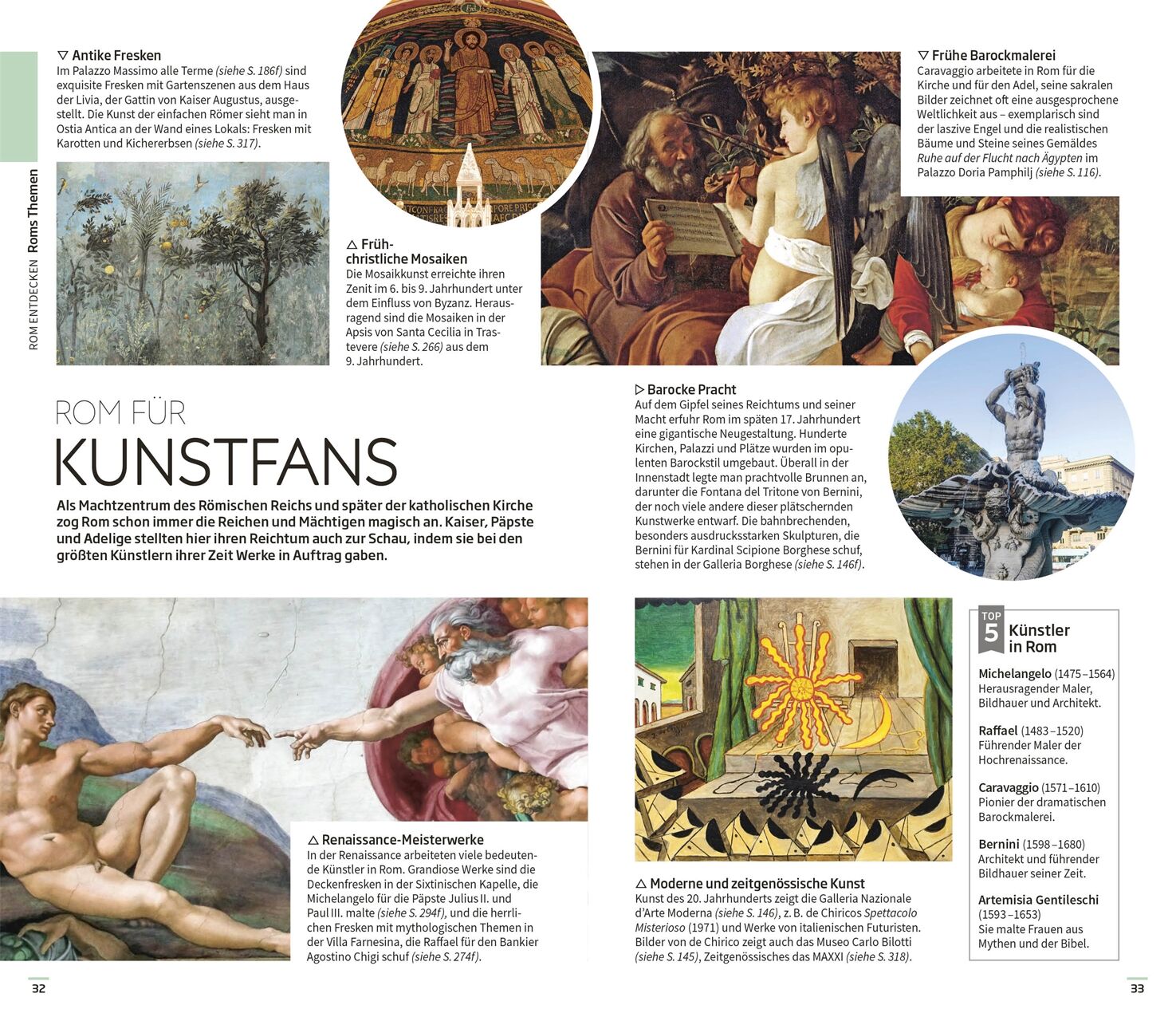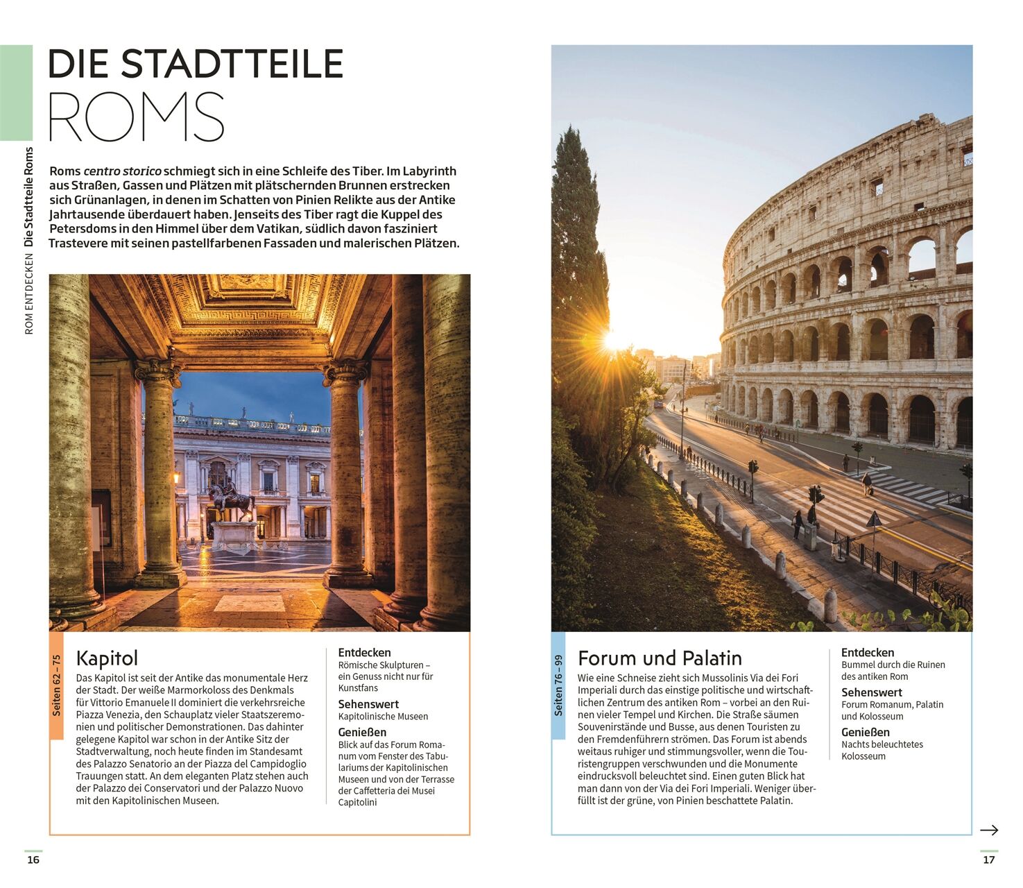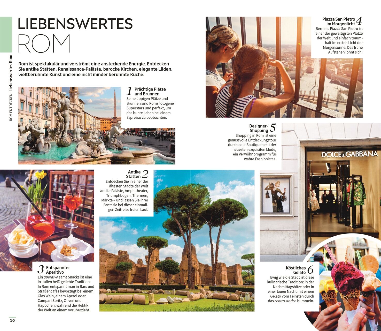 Ausgewählte Top-Themen: Auf den bildgewaltigen Themenseiten des Rom-Reiseführers stehen charakteristische Besonderheiten im Fokus. Entdecken Sie Roms einzigartige Architektur sowie die Meisterwerke der Kunstgeschichte oder das quirlige Leben am Abend mit Theateraufführungen, Festivals oder Live-Konzerten.