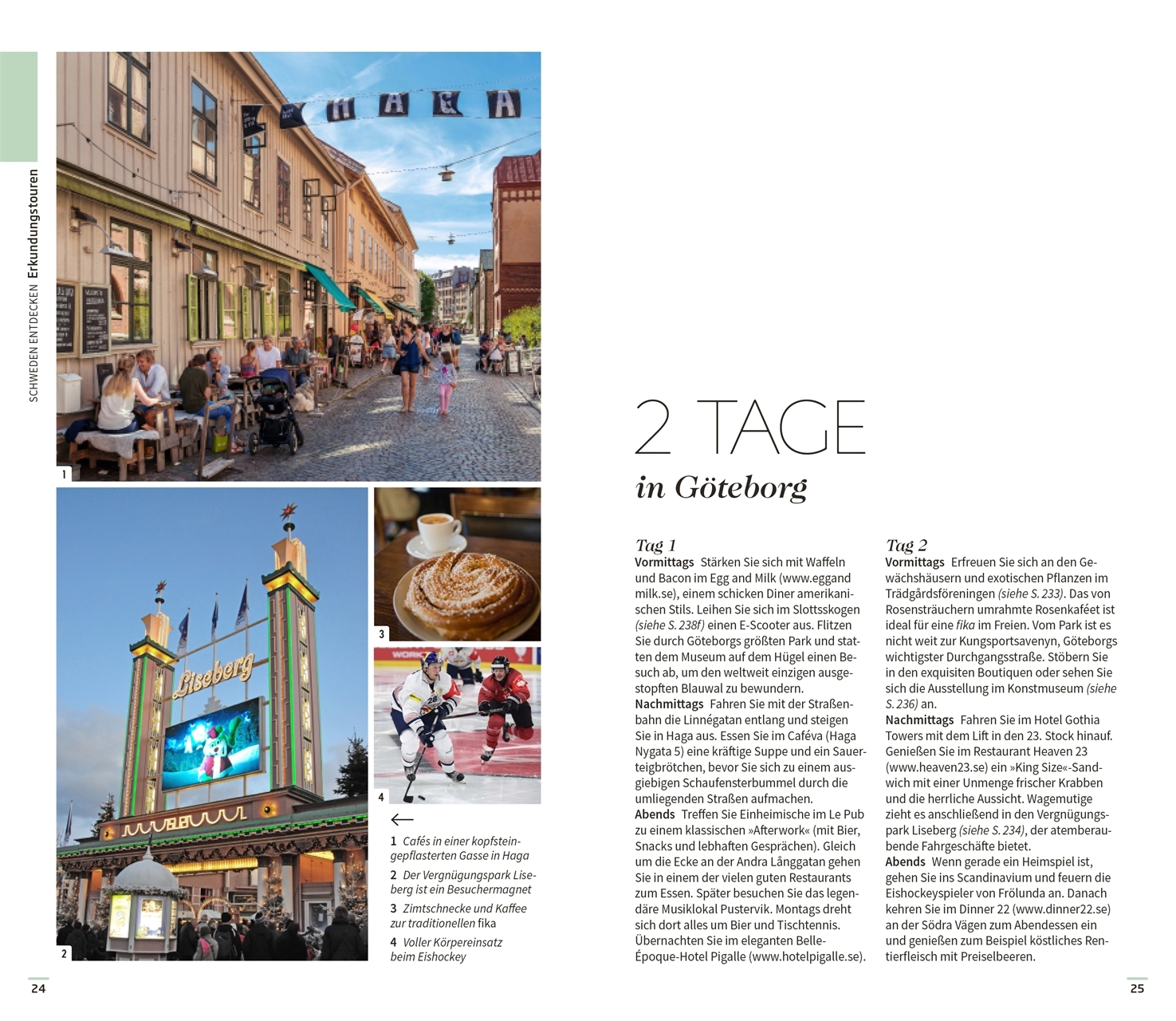 • Unvergessliche Touren und Spaziergänge: Entlang beeindruckender Sehenswürdigkeiten spazieren und dabei alles Wichtige über Architektur, Kirchen, Museen oder Plätze erfahren: Handgezeichnete Spaziergänge nehmen Sie mit auf eine erlebnisreiche Route zum Beispiel durch Västra Nordstan, das Zentrum der Hafenstadt Göteborg. Verschiedene Touren, wie beispielsweise die Bootstour am Dalsland Kanal, zeigen Ihnen spezielle Highlights der verschiedenen Regionen.