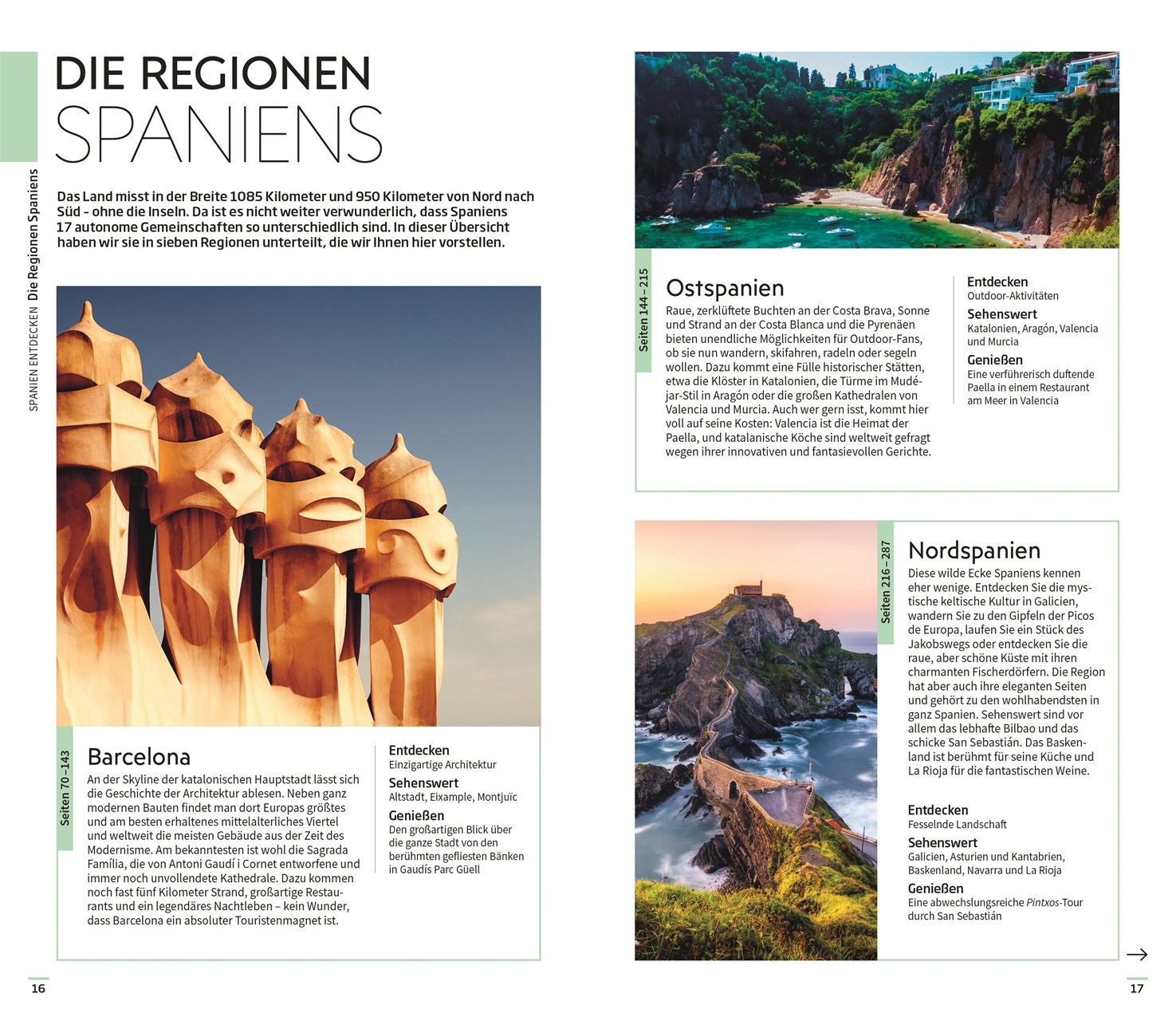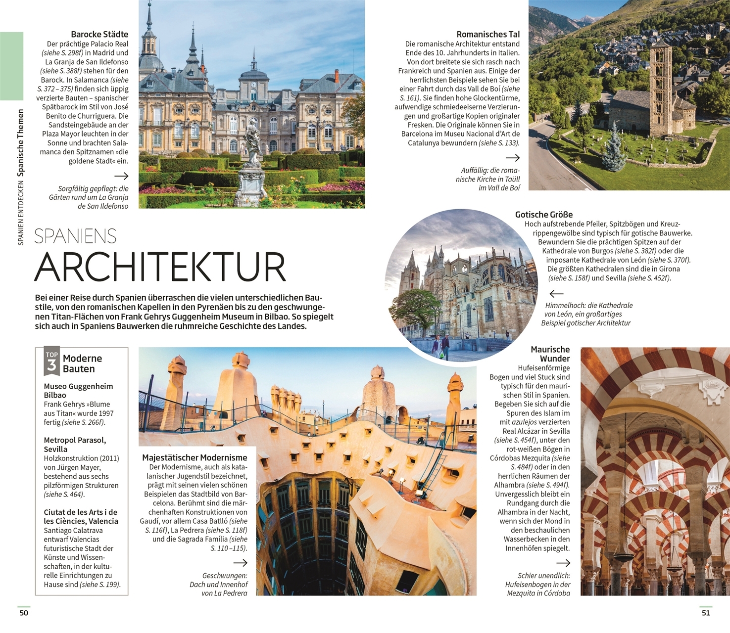 • Ausgewählte Top-Themen: Auf den bildgewaltigen Themenseiten des Spanien-Reiseführers stehen charakteristische Besonderheiten im Fokus. Entdecken Sie eindrucksvolle Architektur, ausgezeichnete Weine, die exzellente spanische Küche, spannende Outdoor-Aktivitäten und vieles mehr.