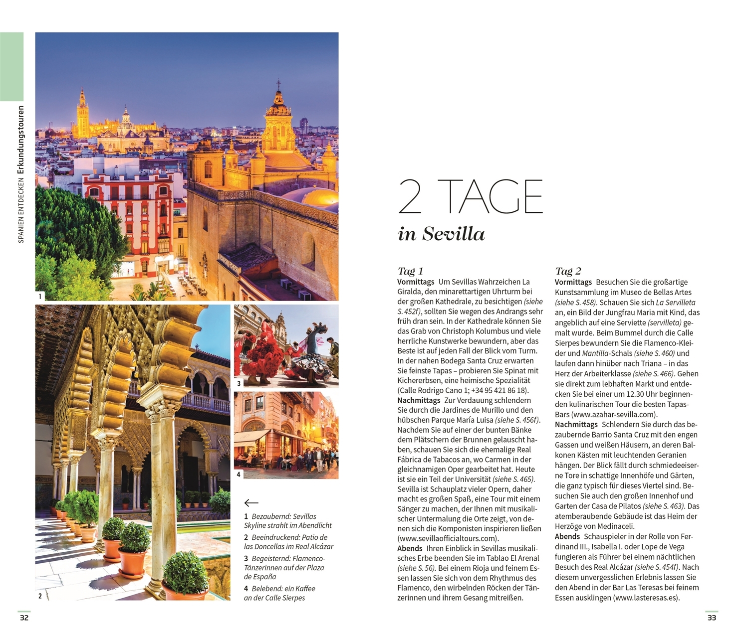 • Das Beste für Ihren Spanien Urlaub: Egal ob ein Wochenende, eine Woche oder länger eine Reise nach Spanien lohnt sich! Für alle, die nur wenig Zeit haben, das Land zu erkunden, gibt es facettenreiche Tipps, um das Beste aus ihrem Trip herauszuholen. So helfen beispielsweise die Routenvorschläge 24 Stunden in Madrid oder 2 Tage in Sevilla in kurzer Zeit möglichst viele Highlights der beiden Städte zu entdecken. Bei der Tour 5 Tage in Andalusien werden Sie zu zahlreichen Sehenswürdigkeiten in Granada, Córdoba, Sevilla, Ronda und Málaga geführt.