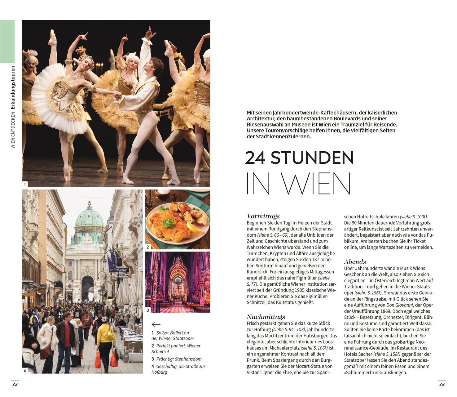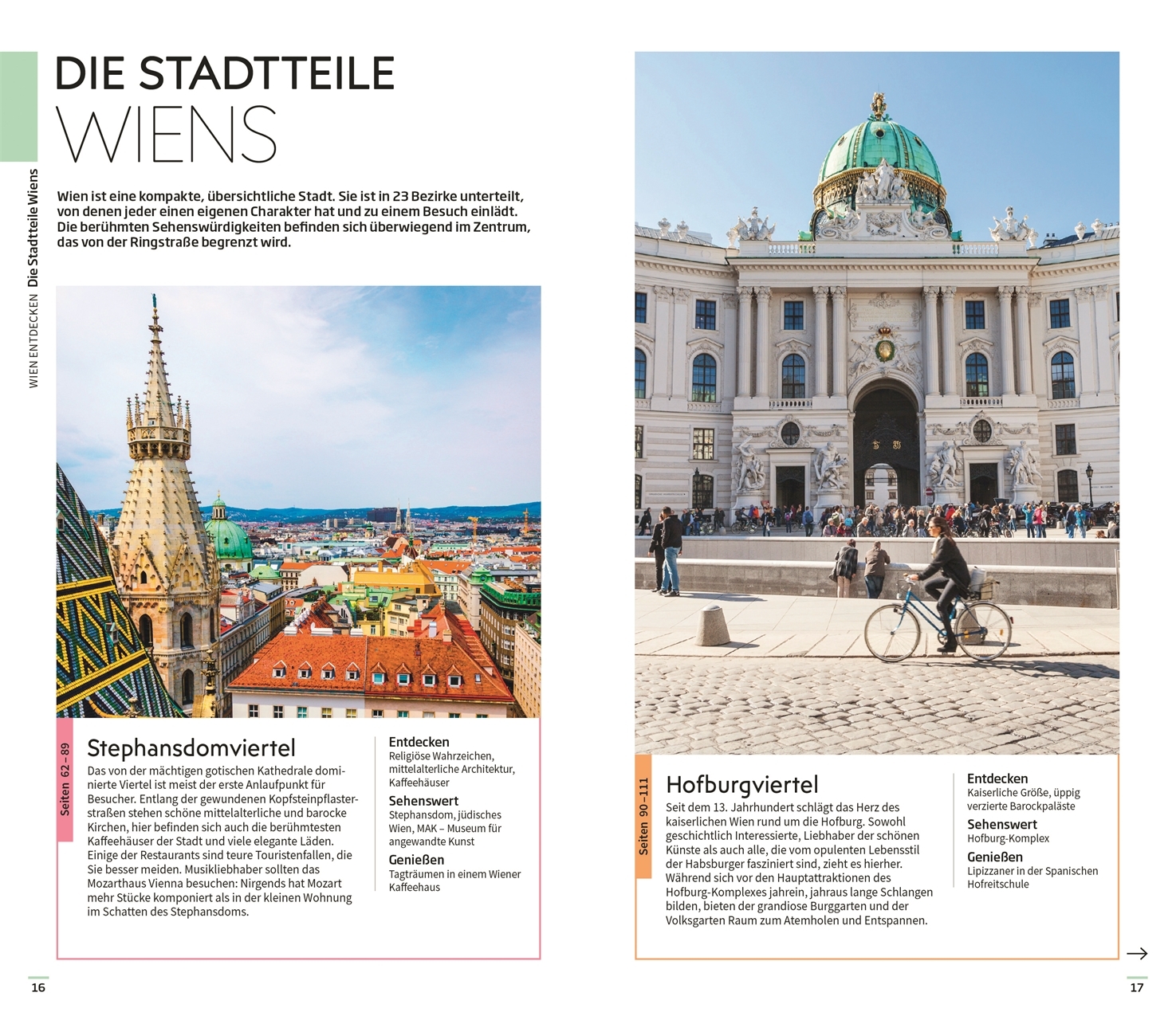 Die fabelhaftesten Orte stellen sich Ihnen im Reiseführer Wien Viertel für Viertel in ihrer gesamten Pracht vor - mit fundierten und qualitativen Inhalten sowie unvergesslichen Highlights aus Kultur und Alltag. Vom Hofburgviertel mit den Kaiserappartements und der Spanischen Hofreitschule bis zum Schloss Schönbrunn in Hietzing. Spannende Ausflugstipps nehmen Sie auch mit in die Umgebung, wie zum Beispiel nach Baden, dem bekanntesten Kur- und Weinort in den Ausläufern des Wiener Waldes mit eleganten Stadthäusern und heilenden Quellen. Beethoven komponierte hier die 9. Sinfonie.