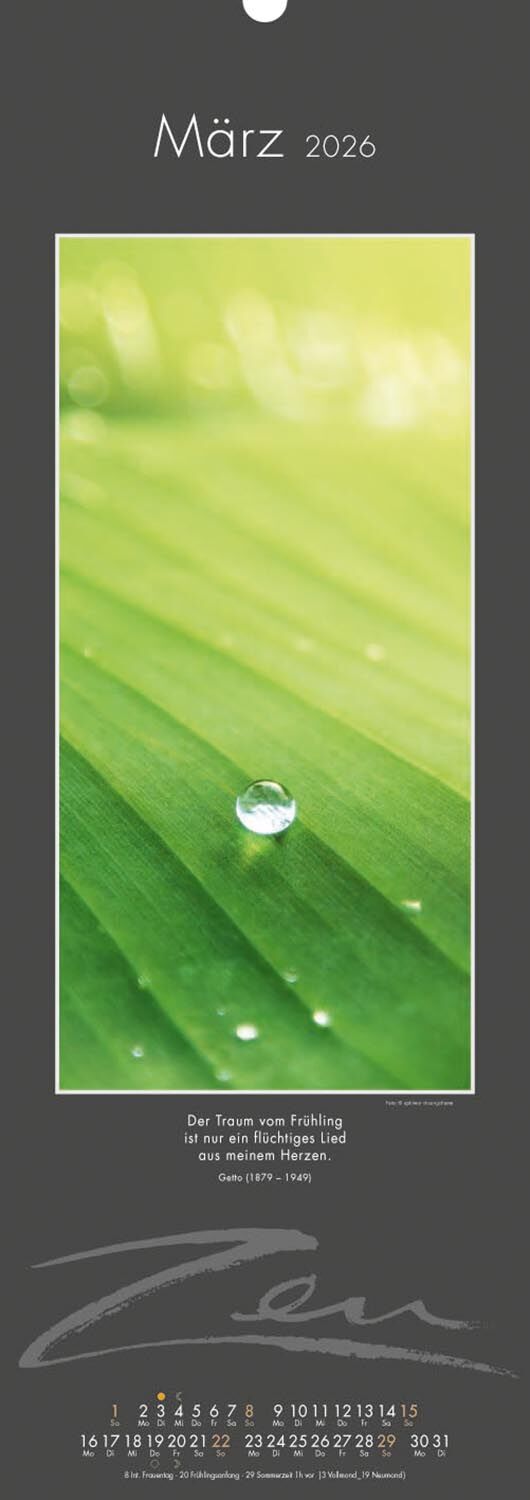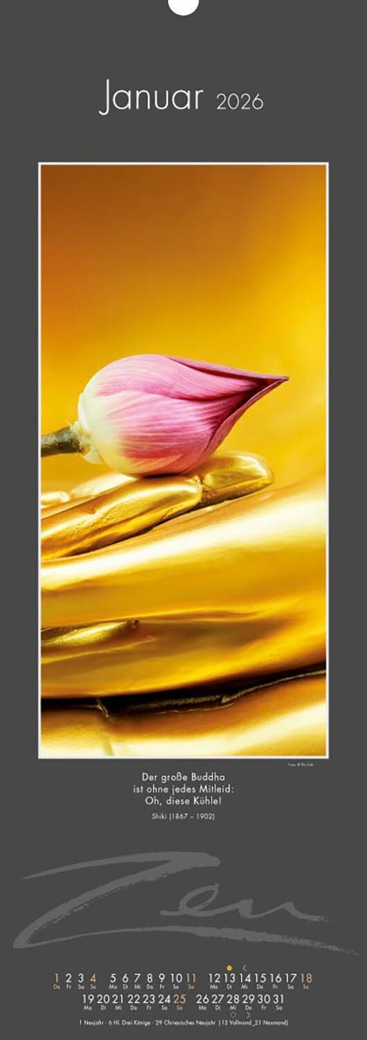Von der Kunst des Weglassens erzählen die Bilder des Zen-Kalenders ausdrucksstark, klar und natürlich. Die Einfachheit von Zen wird in eine poetische Bildsprache umgesetzt. Der Blick richtet sich auf das Schlichte und Unscheinbare und lässt es in seiner ganzen...