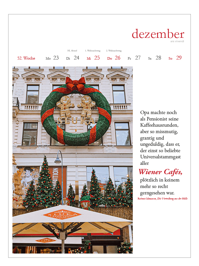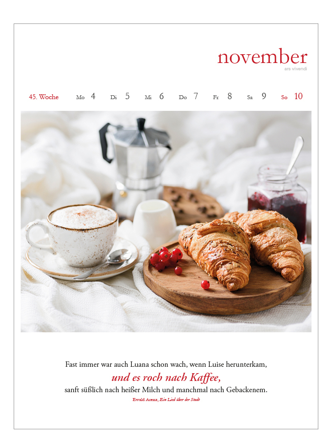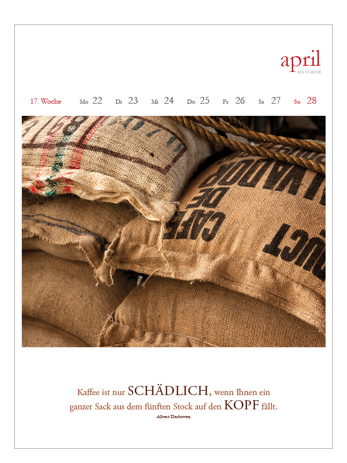 Egal, ob als Stammgast oder als hineinschnuppernder Besucher, das Café ist ein Ort, an dem man sich wohlfühlt. Und dafür sorgen vortreffliche Cappuccini, Espressi & Co. Der ideale Kalender für alle Kaffeeliebhaber! Kalender mit 53 Motiven und literarische...