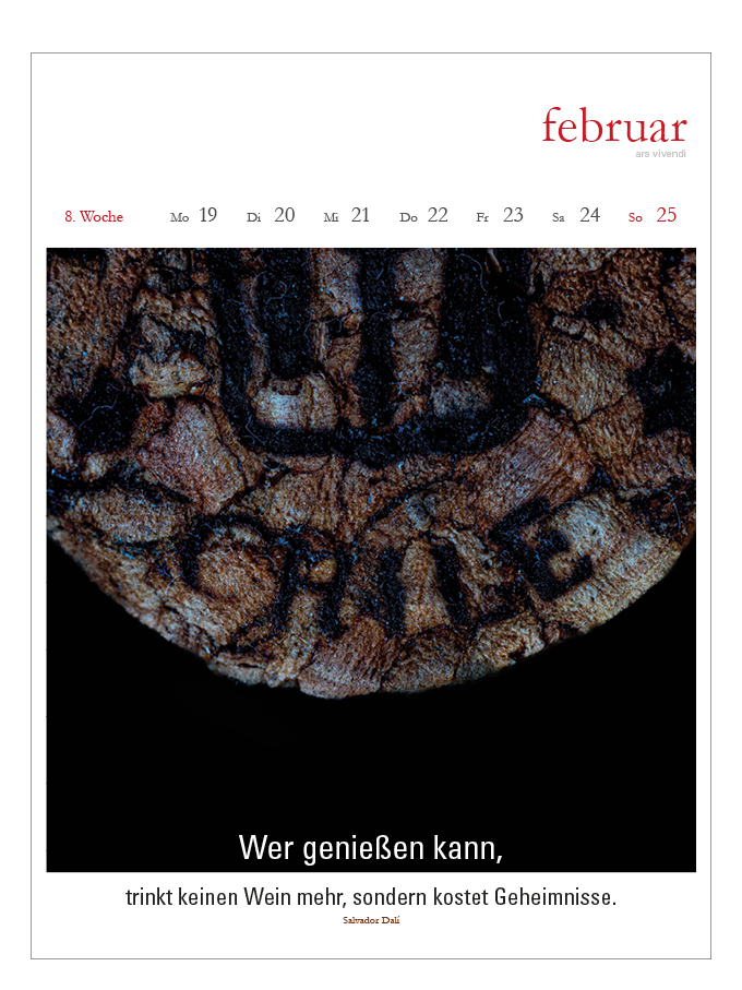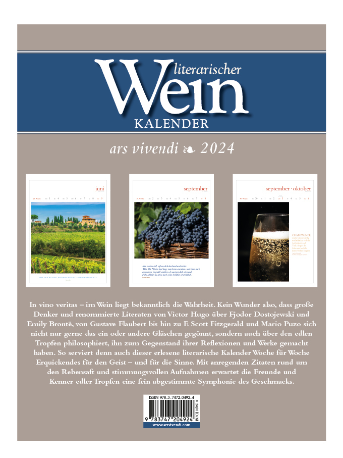 In vino veritas! Mit vollmundigen Zitaten berühmter Literaten und einer berauschenden Bildauslese bietet dieser Wein-Kalender ein wahres Fest der Sinne. Der ideale Kalender für alle Weinliebhaber! - Wochenkalender im Hochformat 24x32 cm - zurückhaltendes Kale...