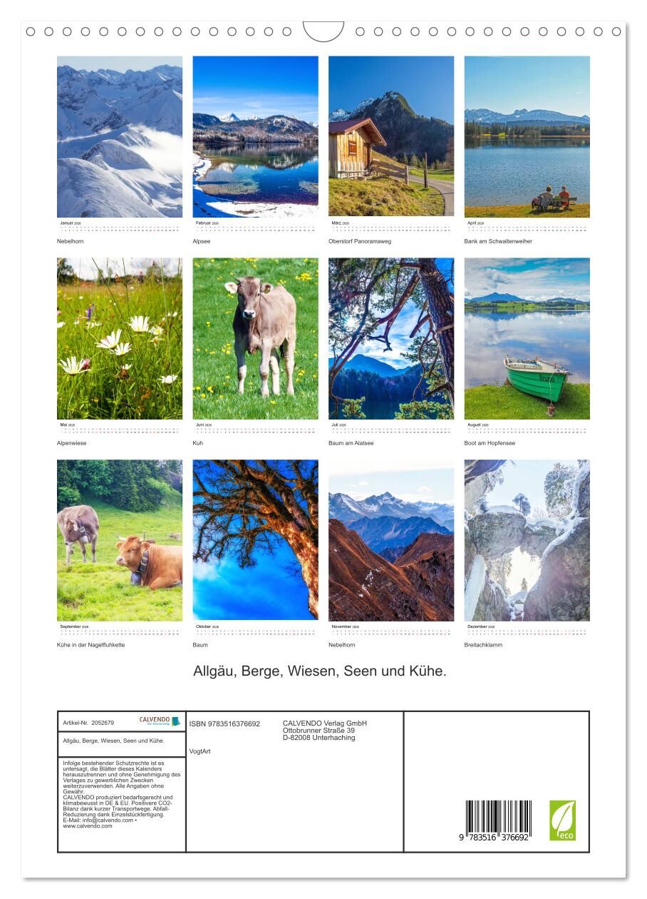 Allgäu, Berge, Wiesen, Seen und Kühe. (Wandkalender 2026 DIN A3 hoch), CALVENDO Monatskalender