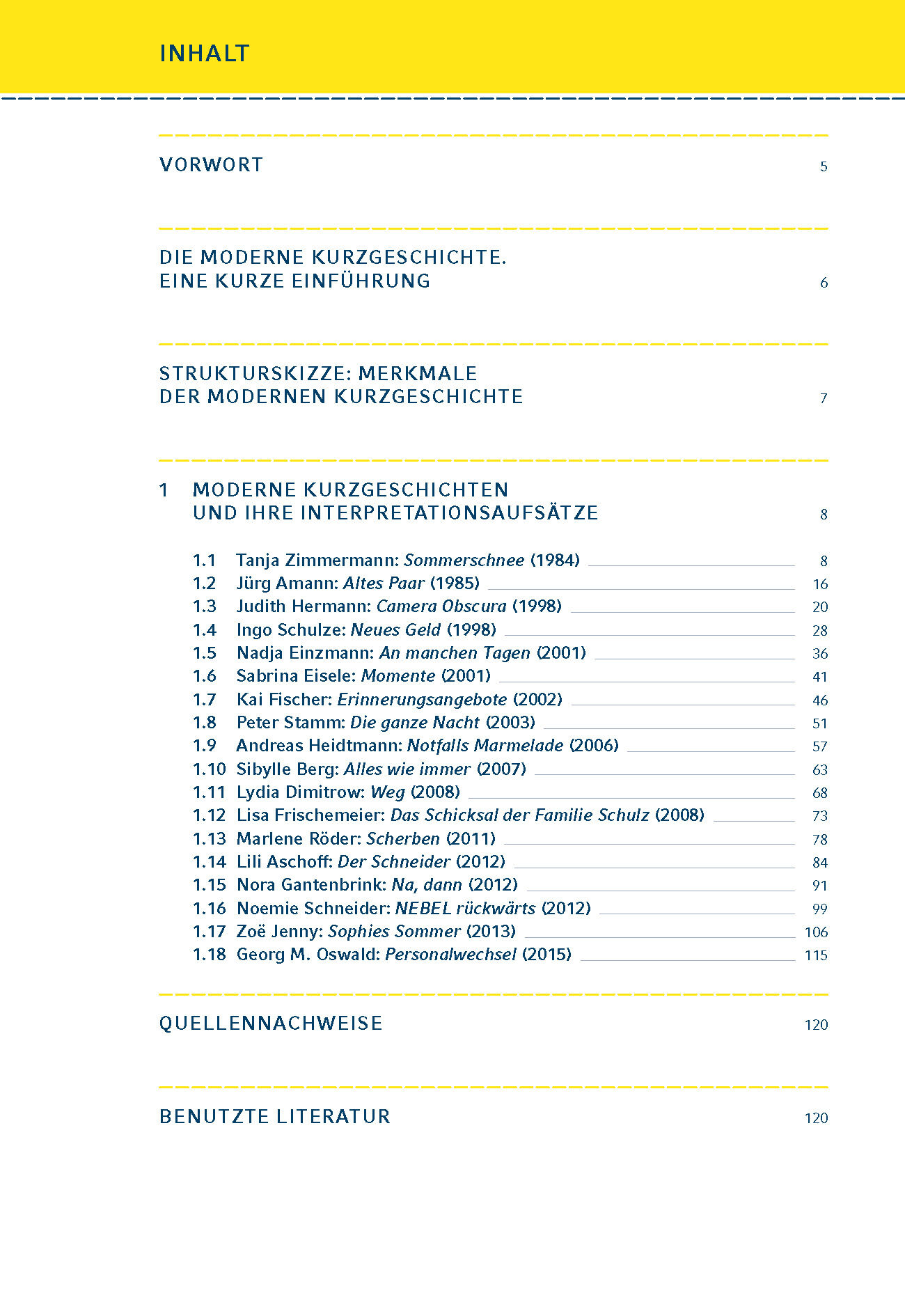 18 moderne Kurzgeschichten analysiert und interpretiert: - Tanja Zimmermann: Sommerschnee (1984) - Jürg Amann: Altes Paar (1985) - Judith Hermann: Camera Obscura (1998) - Ingo Schulze: Neues Geld (1998) - Nadja Einzmann: An manchen Tagen (2001) - Sabrina Eisel...