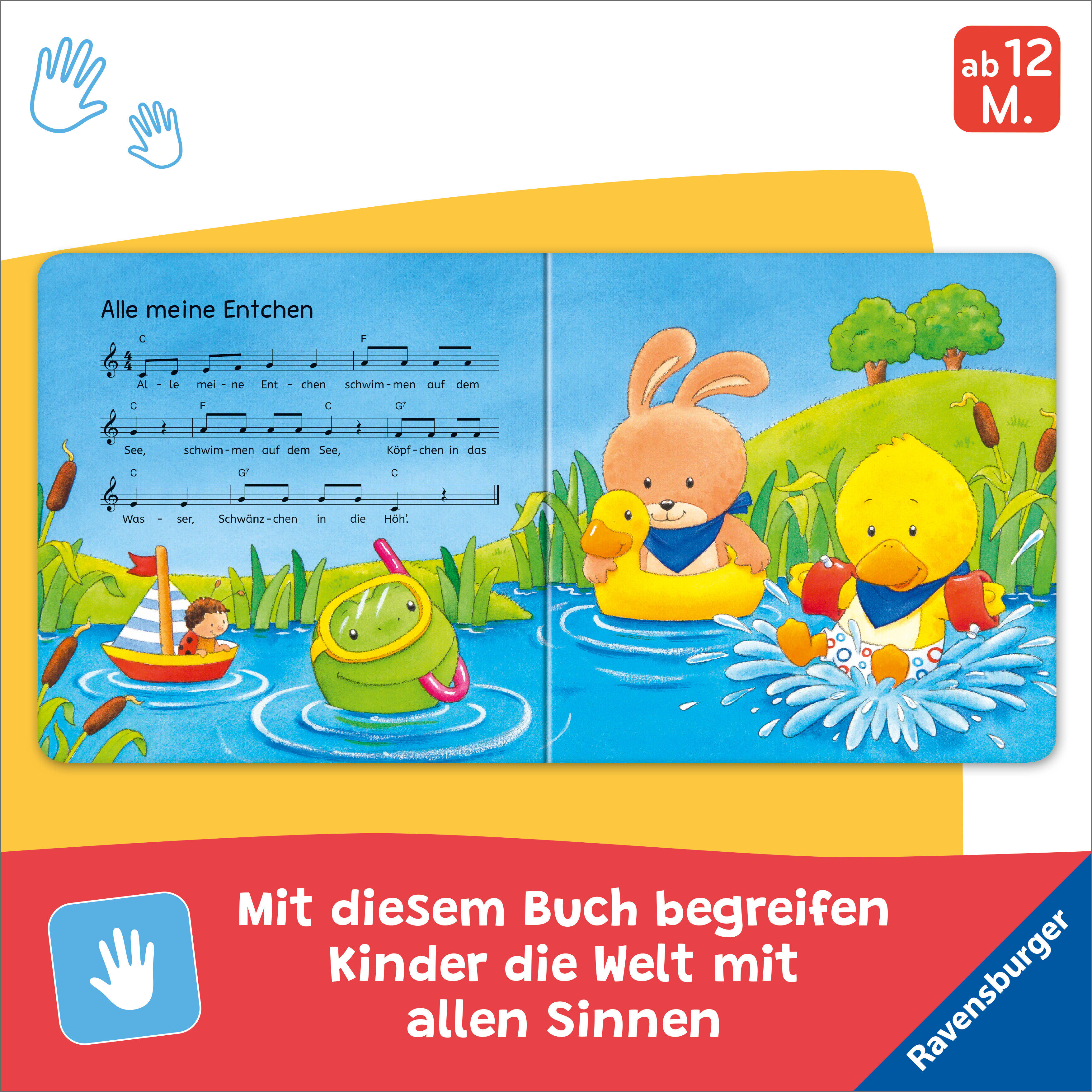 Fünf Kinderlieder erklingen wie durch Zauberei, wenn die passende Seite aufgeschlagen wird. So können schon Kinder ab 12 Monaten ihr Lieblingslied selbst aussuchen und ohne Hilfe anhören. Alle meine Entchen, Backe, backe Kuchen, Bruder Jakob, Summ, summ, summ ...