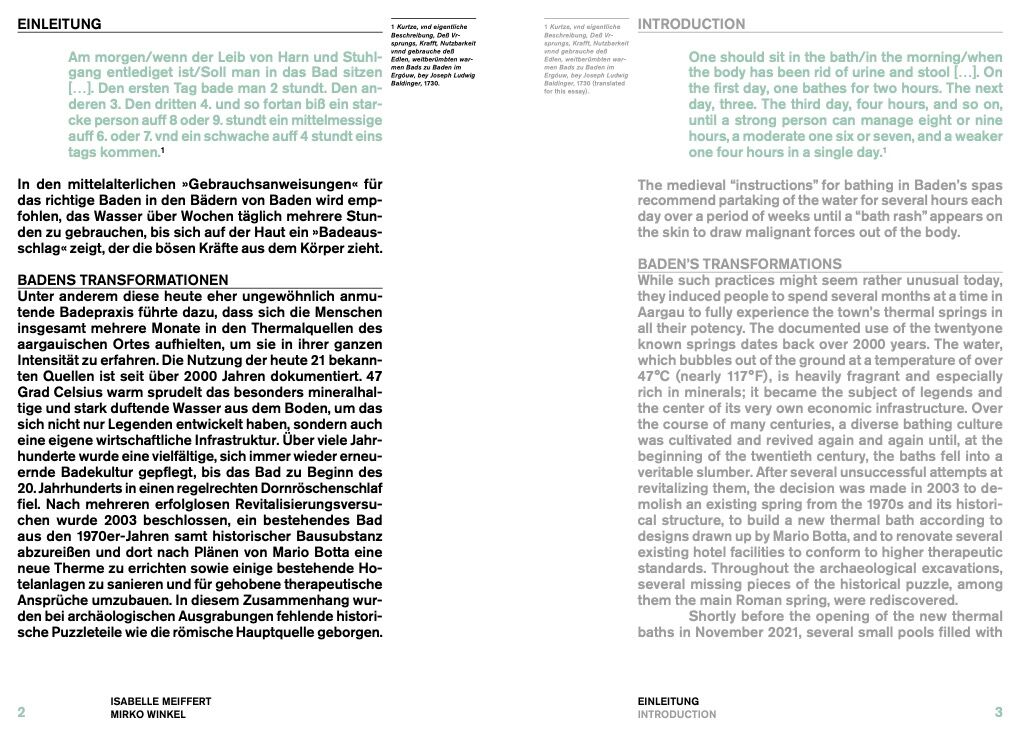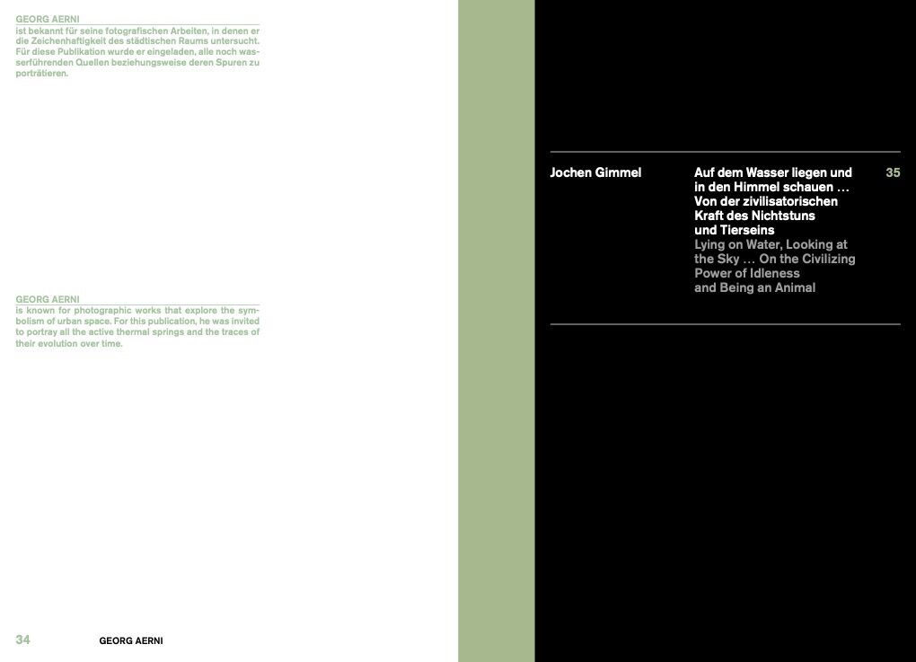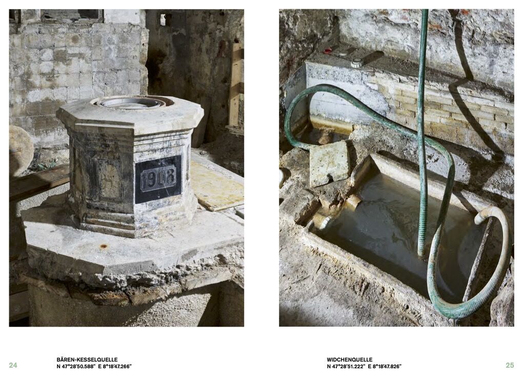 The book gathers works of art by Alfredo Jaar, Bianca Kennedy, Fabian Knecht, the collective Arpha, Susanne Lorenz, Sabian Baumann, Corinn Gerber, and others as well as a dedicated series of photographs by Georg Aerni that records traces of the thermal springs' history throughout the towns of Baden and Ennetbaden.