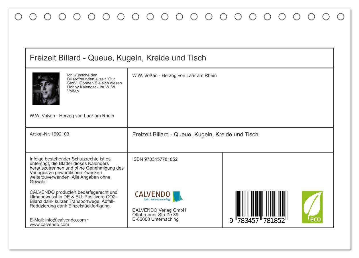 Wer Kreide, Queue und Kugeln mag, wer Billard mag, wird sich über diesen fantastischen Kalender freuen. Ideal für alle Billardfreunde und -fans und toll als Geschenk. Gönnen Sie sich dieses seltene Werk zum Thema Billard. Herzlichst . . . Ihr W. W. Voßen