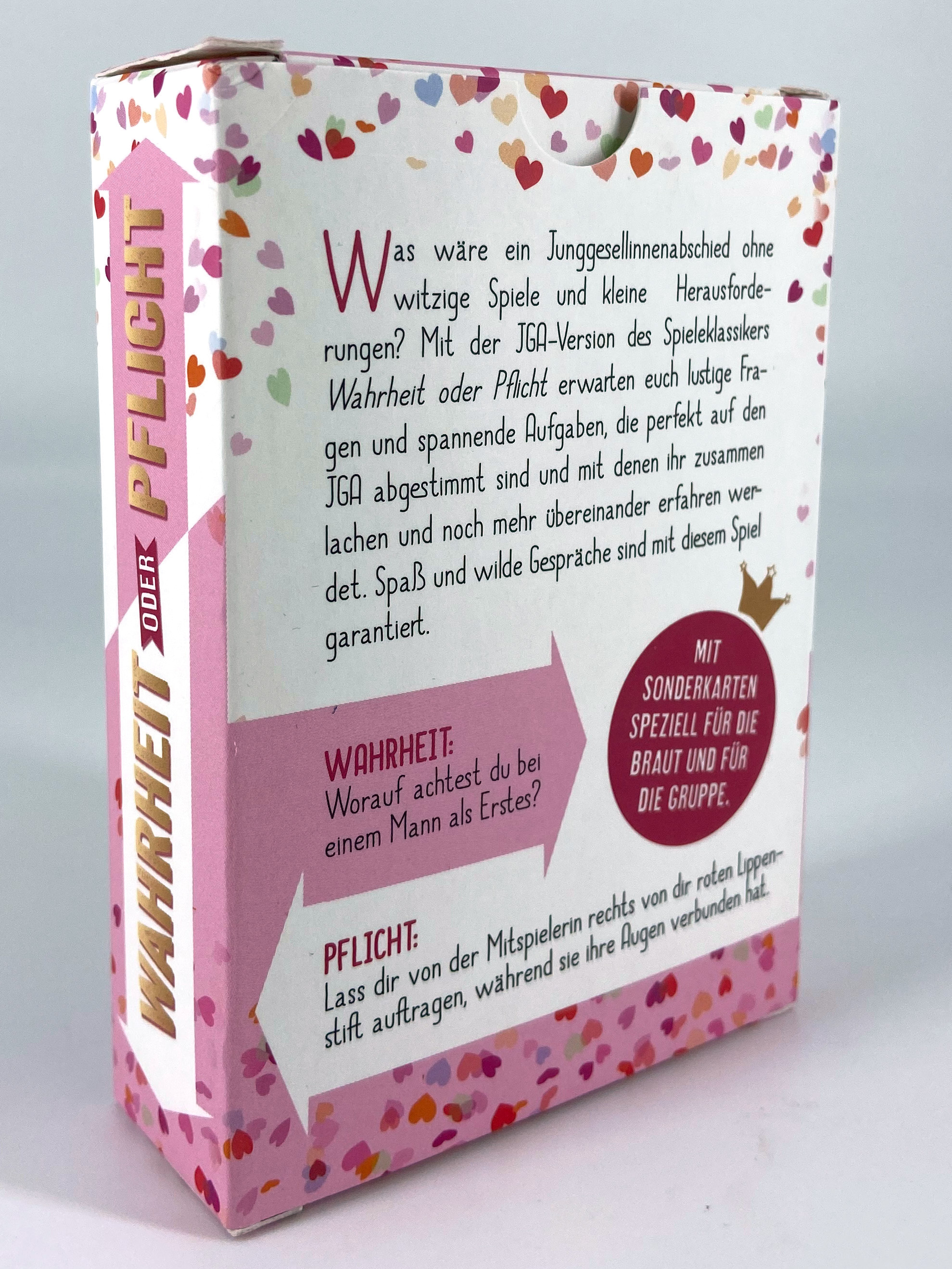 Was wäre ein Junggesellinnenabschied ohne witzige Spiele und kleine Herausforderungen? Mit der JGA-Version des Spieleklassikers Wahrheit oder Pflicht erwarten euch lustige Fragen und spannende Aufgaben, die perfekt auf den JGA abgestimmt sind und mit denen ihr...