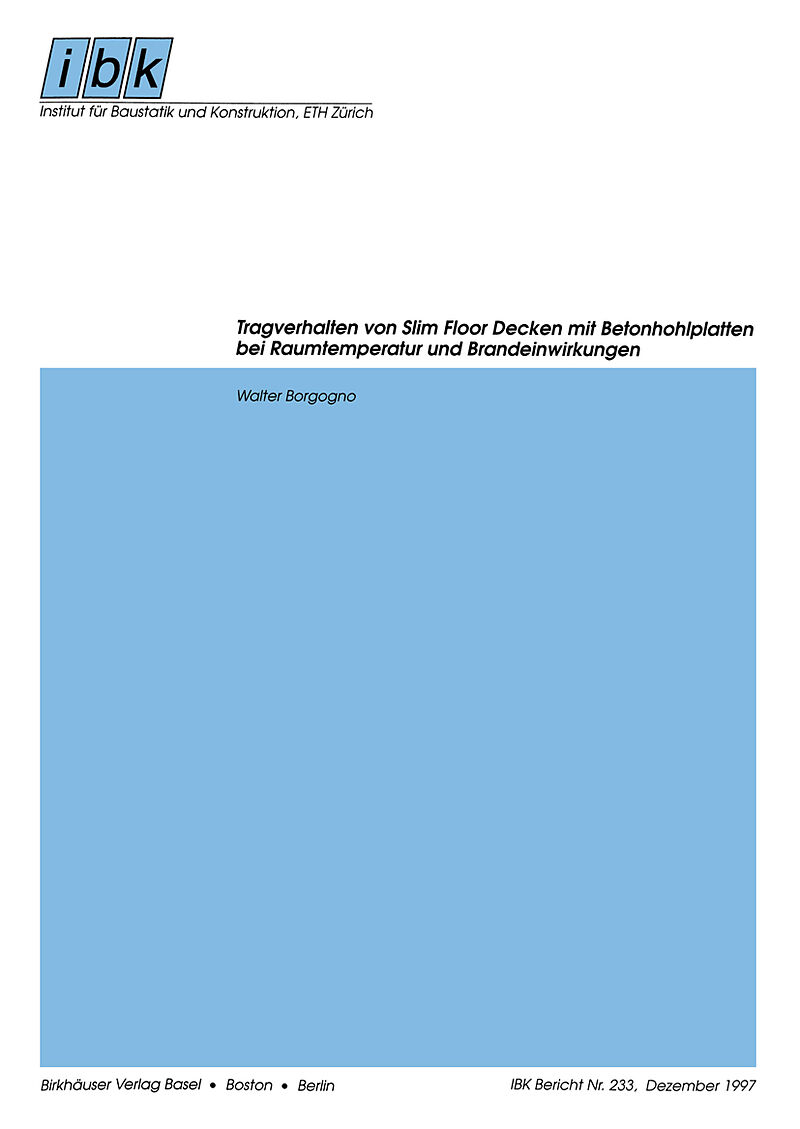 Der vorliegende von Herm Walter Borgogno als Promotionsarbeit verfasste Bericht befasst sich mit dem Tragverhalten von Slim Floor Decken mit Betonhohlplatten bei Raumtemperatur und Brandeinwirkungen. Er entstand im Rahmen eines Forschungsprojektes zur Forderun...