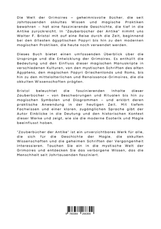 Die Welt der Grimoires geheimnisvolle Bücher, die seit Jahrtausenden okkultes Wissen und magische Praktiken bewahren hat eine faszinierende Geschichte, die tief in die Antike zurückreicht. In "Zauberbücher der Antike" nimmt uns Walter F. Bristol mit auf eine R...